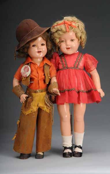 Description American, circa 1930s. One is embossed "Shirley Temple" on head and body, original mohair wig in original set, lashed flirty eyes, open mouth with teeth, jointed neck, shoulders and hips, original undergarments, replaced dress and shoes. The other is unmarked, composition head has original brown human hair wig, lashed brown sleeping eyes, open mouth with teeth, jointed neck, shoulders and hips, original cowgirl costume with hat, gun, holster, and reproduction Shirley Temple pin. Shirley has large cracks on face and one leg crazed. Cowgirl has soil on costume, overall crazing, and finger missing. Condition (Fair). Size 25" T.
