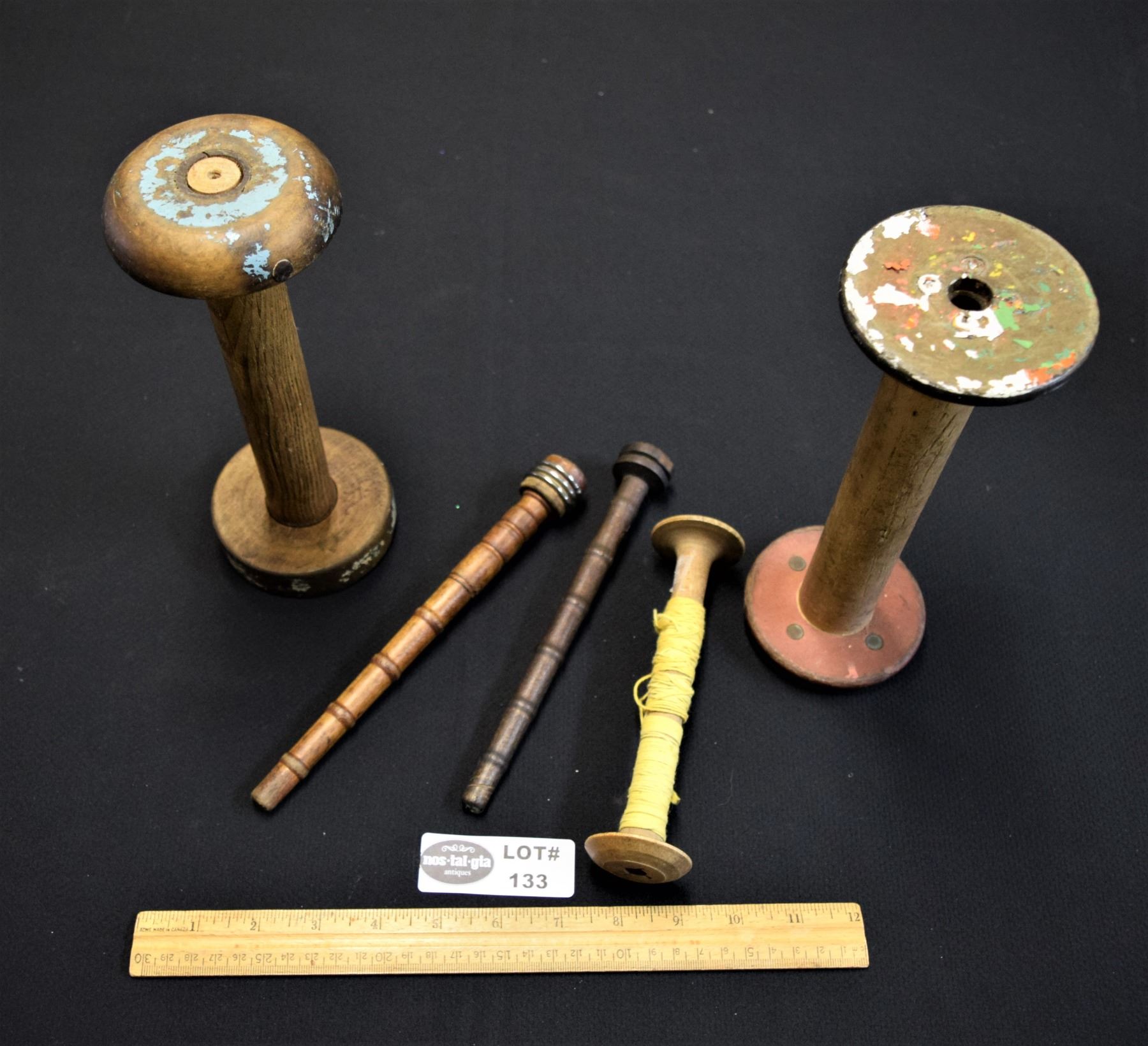 Lot of 2 Large and 3 Small Vintage Textile Mill Wood Spools