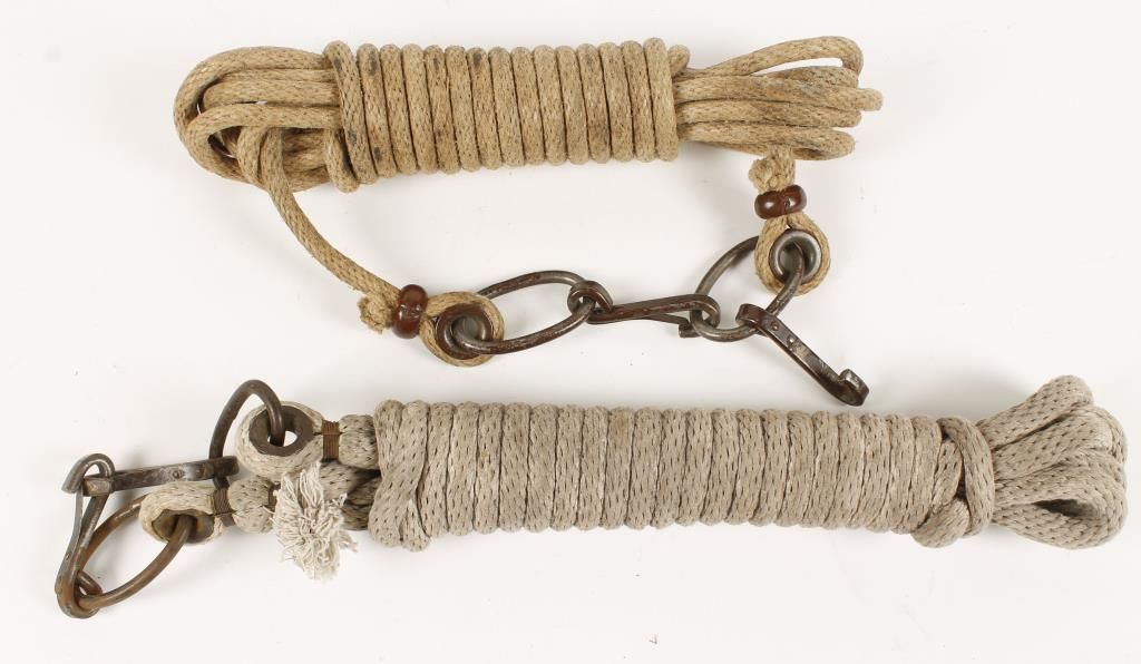 (1) Model 1904 Lariat. Snap spring missing. Aged with some loss to finish on metal, and rope shows some wear. (1) Model 1885 Lariat. (1) Buckle has been replaced at depot with 1908 buckle which is marked "R.I.A. 1908". In aged condition, the original buckle has surface rusting and the replaced buckle has rusting and loss to brown lacquer finish.