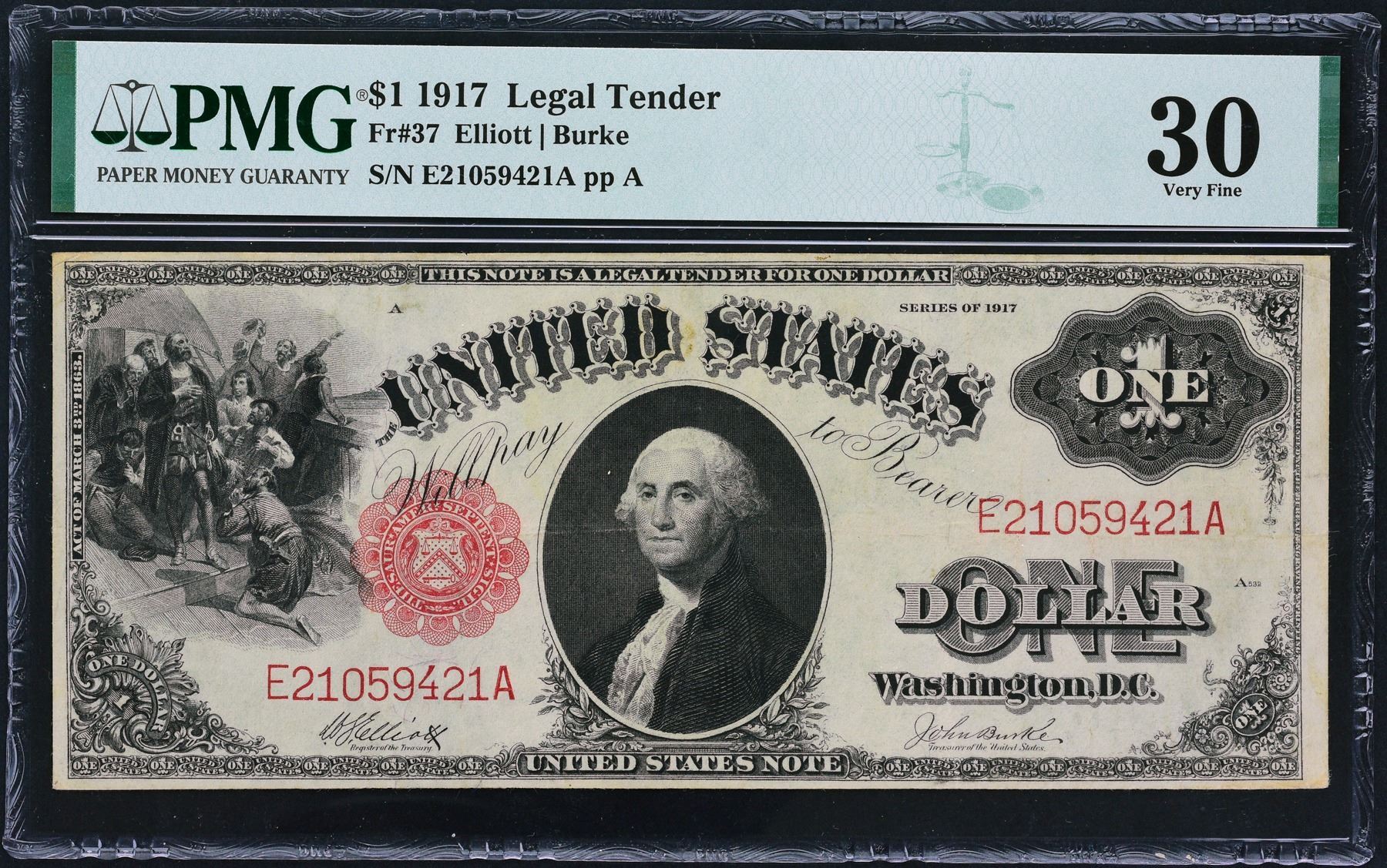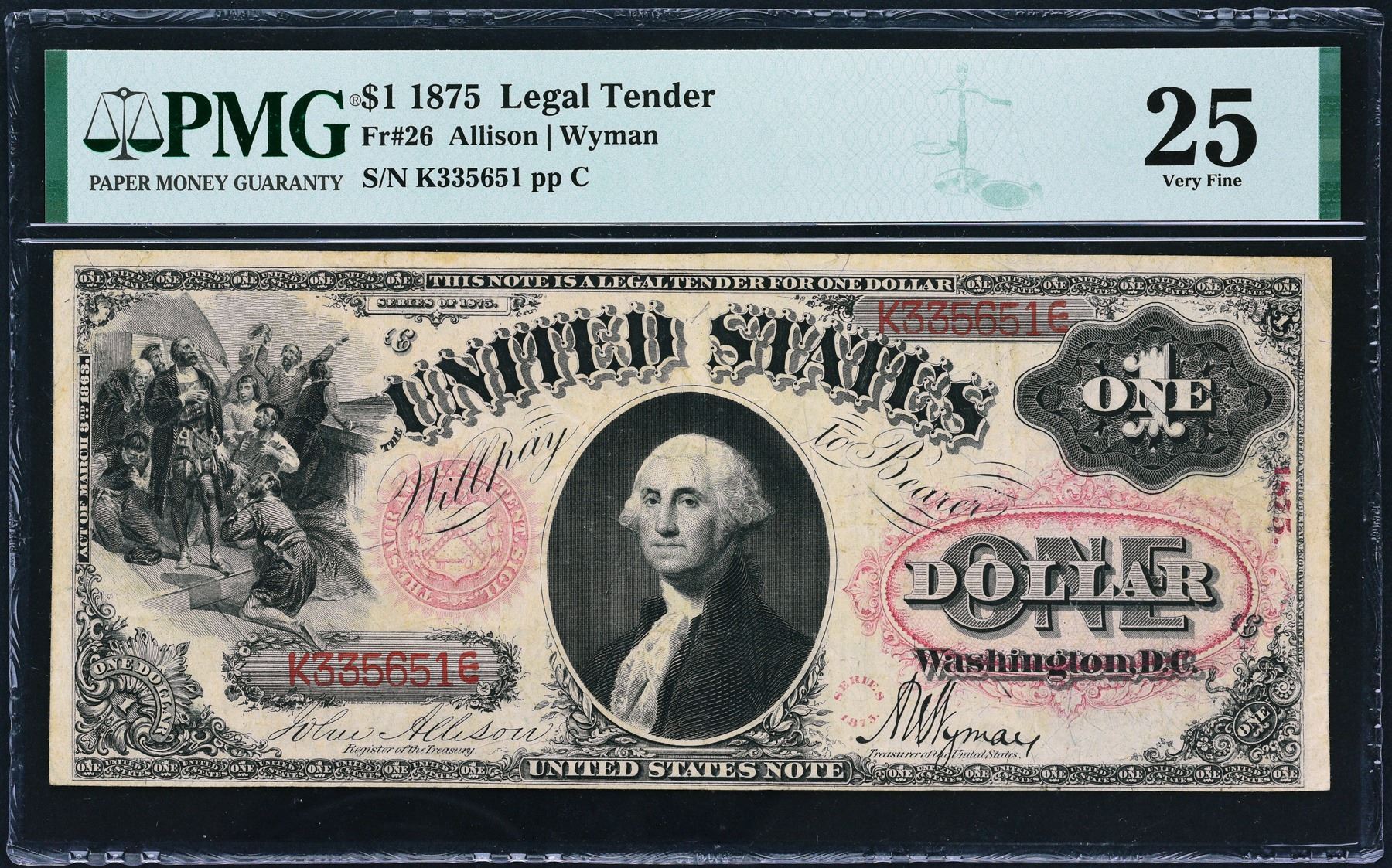 Description: Includes the following: Fr. 26 $1 1875 Legal Tender PMG Very Fine 25; Fr. 37 $1 1917 Legal Tender PMG Very Fine 30
