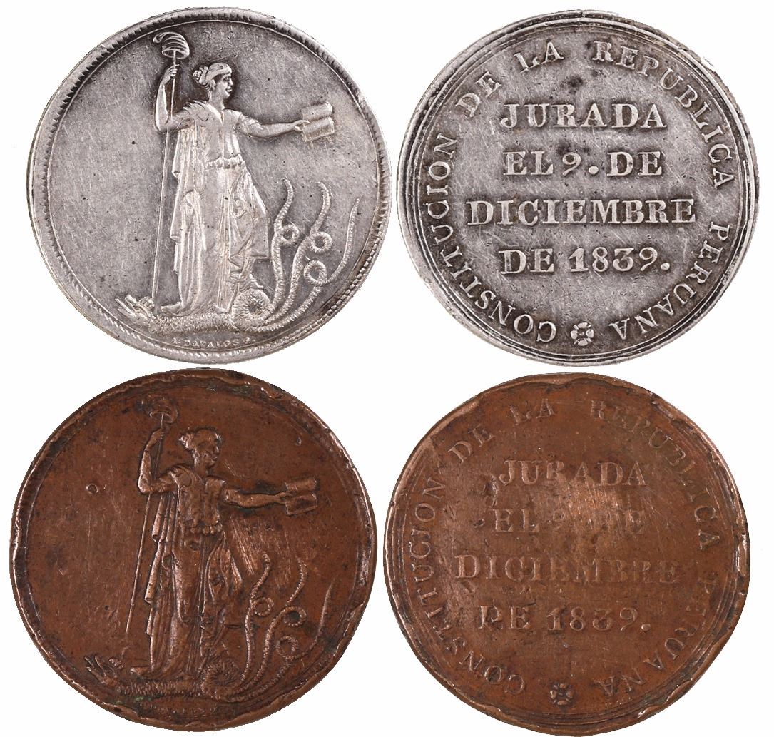Lot of 2 Lima, Peru, large Constitution proclamation medals, 1839, one in silver and one in copper.
