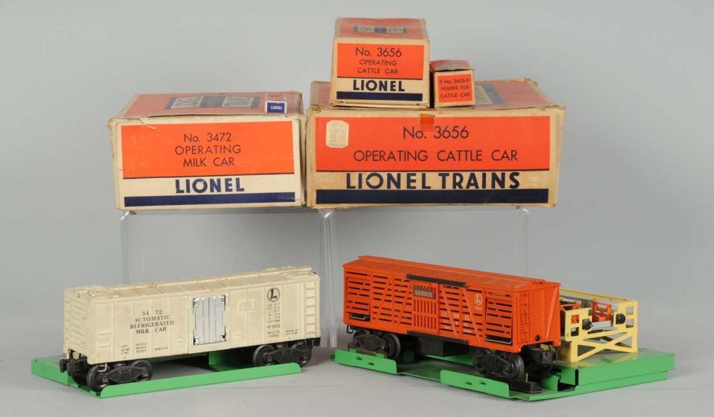 Includes 3472 operating milk car with ramp and 3656 cattle ramp with car. Cattle car comes with boxed original cattle and box for car. Milk car comes with original box for milk cans. Boxes include appropriate inserts. Both units and boxes are in excellent condition. Post-war Train