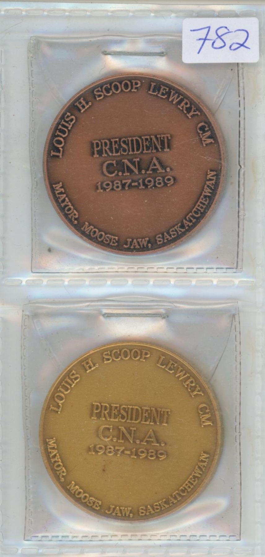 Lot of 2 Louis “Scoop” Lewry, Canadian Numismatic Association 1987 – 1989 Presidential Medals in 2 different metals. Lewry was also mayor of Moose Jaw, Sask.
