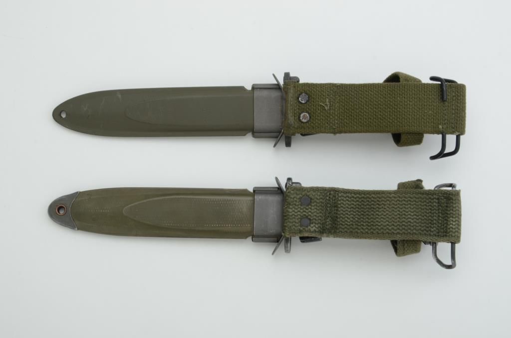 Lot of 2 M-5 bayonets with checkered black plastic grips, 6.7” blades with M8A1 scabbards and olive green woven hangers, issued for the M-1 Garand; both in very good condition, on by PWH, the other by B M Co.Est.: $50-$100.
