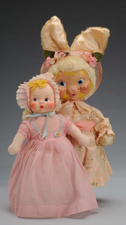 American, circa 1940s. One is Gund Vinyl mask-face bunny with large blue painted eyes, painted whiskers, open mouth with upper teeth, fuzzy bunny body and ears, original tagged taffeta dress, matching hat, and undergarments. Other doll is mask-face baby, blue side-glancing eyes, strands of yellow yarn hair, original pink organdy dress, matching hat, and undergarments. Condition (Excellent). Size Largest: 20" T.