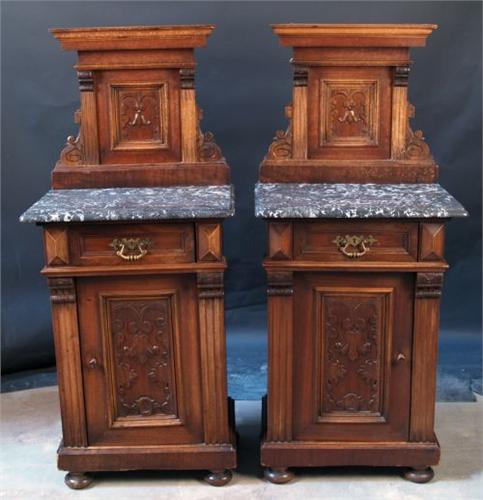 Lot of 2 Matching Victorian Night Stands w Marble tops very ornate appears to be Cherry Wood