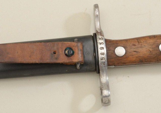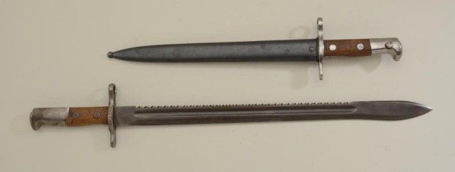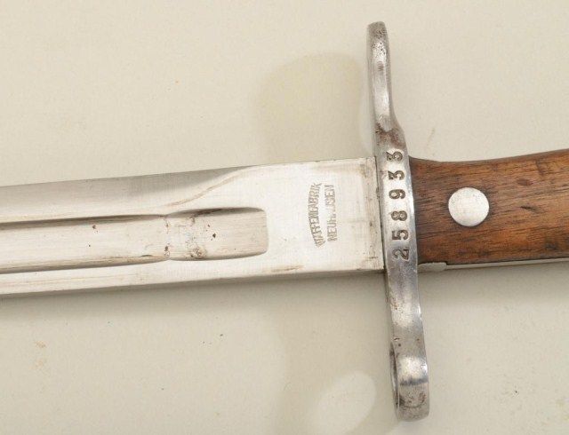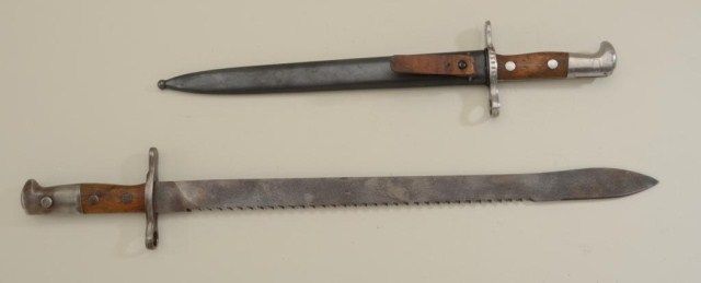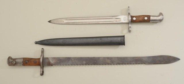 Lot of 2 Mauser bayonets, one marked “Waffenfabrik Neuhausen” with sheath and in overall very good condition, the other is a large saw back bayonet marked “Elsener Schwyz” (no sheath) in overall goodcondition. Est.: $125-$250.