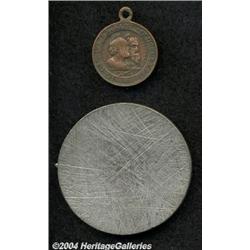 <B>Lot of 2 Medals as follows:</B></I> Pius IX small copper medal 1867, 20 mm, Bust right/Two Saints, Fine with mounting at top; and a Pius VII Uniface Lead medal No Date, Bust Right, XF with scratches reverse. 2 medals <BR><BR><B>Important notice:</B> Heritage usually auctions material at the rate of 200-250 lots per hour. On some occasions eBay Live bid software or the Internet may not be able to keep up with the pace of the auction. We recommend placing a realistic absentee bid now as insurance to avoid disappointment. Occasionally the auctioneer may eliminate or reject an eBay Live bid, and the auctioneer may also reopen a lot after the close of the eBay live bidding (usually because we missed an audience bid), and may reject your bid even if it shows you as the winning bidder. By bidding via eBay Live, you agree that Heritage may award the lot to another bidder at its sole discretion under the circumstances described above or any other reasonable circumstances. Since eBay bids are not shown to us until we open the lot on the floor, we treat those bids just like floor bids. In most cases the floor responds before the eBay bid is presented to us, due to Internet lag time, so for consistency we have made it a policy that floor bids are always considered first over tie eBay live bids. Also please note that all Heritage lots purchased through eBay Live carry a 20% Buyer's Premium. Please make sure you read the Terms and Conditions before you bid.