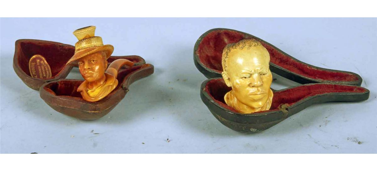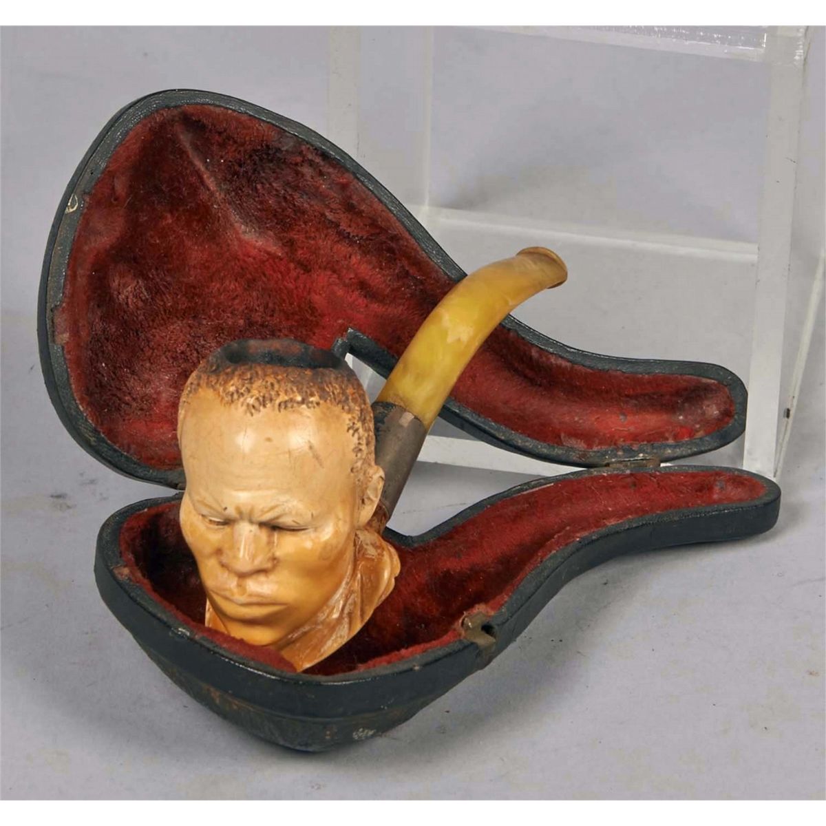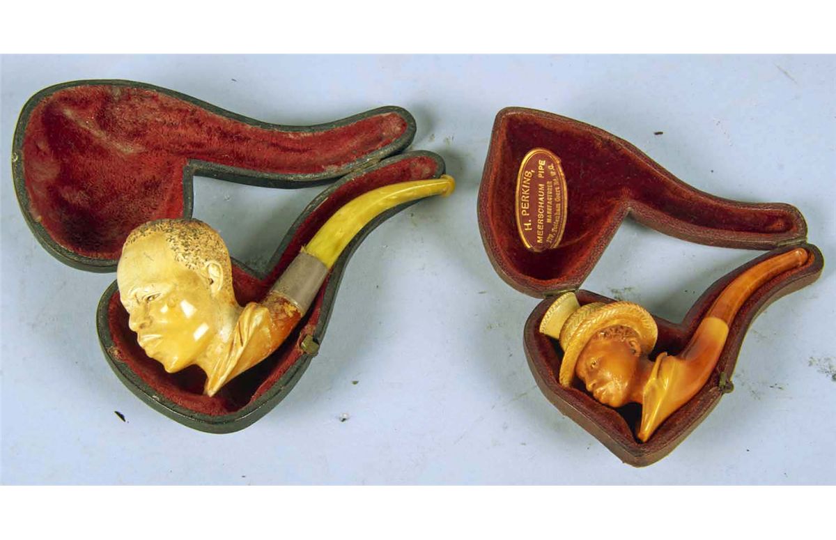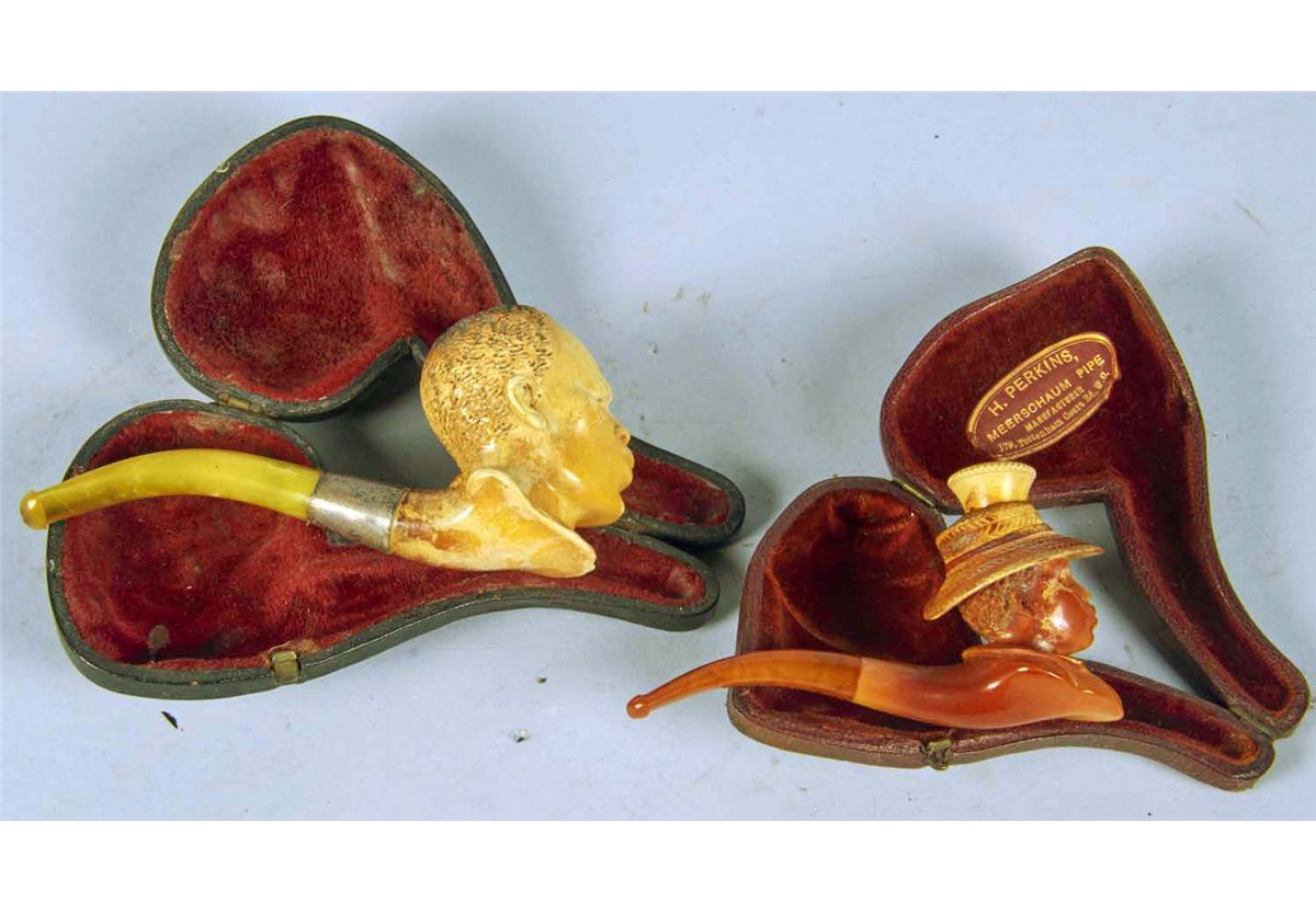 Lot includes: a boy's head with straw hat pipe with removable bowl insert, has small piece missing from insert. In case marked "H. Perkins, Meerschaum Pipe Manufacturer 179 Tottenham Court Rd. W.O.", and a man's head pipe in case, shows aging. Condition (