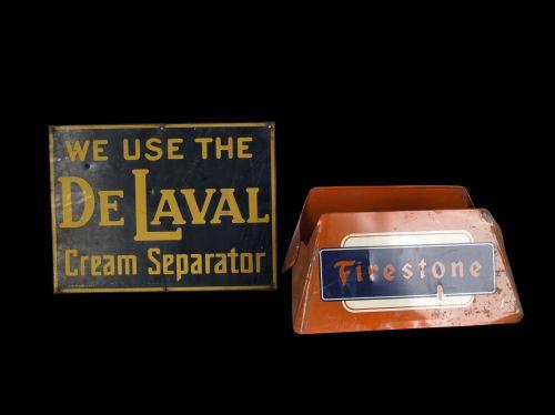 Lot of 2 Metal Adv Items: Firestone Tire Display and a De Laval Cream Separator Sign 7 x 15 and 12 x 6