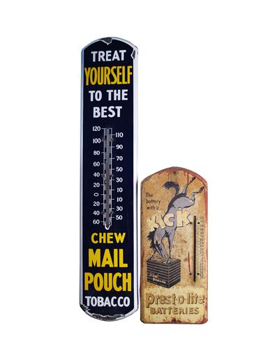 Lot of 2 Metal Wall Adv Thermometers  Mail Pouch 8"x 39" & Presto-Lite Batteries 9"x 20"