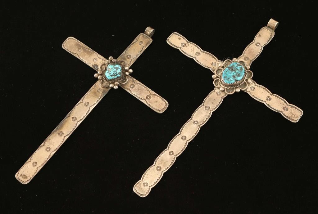 Both crosses feature a turquoise nugget on a sterling cross; maker marked "CW" on the backs. Smaller measures 6" and the longest measures 6 1/4". These are the type used by priests in the catholic church.