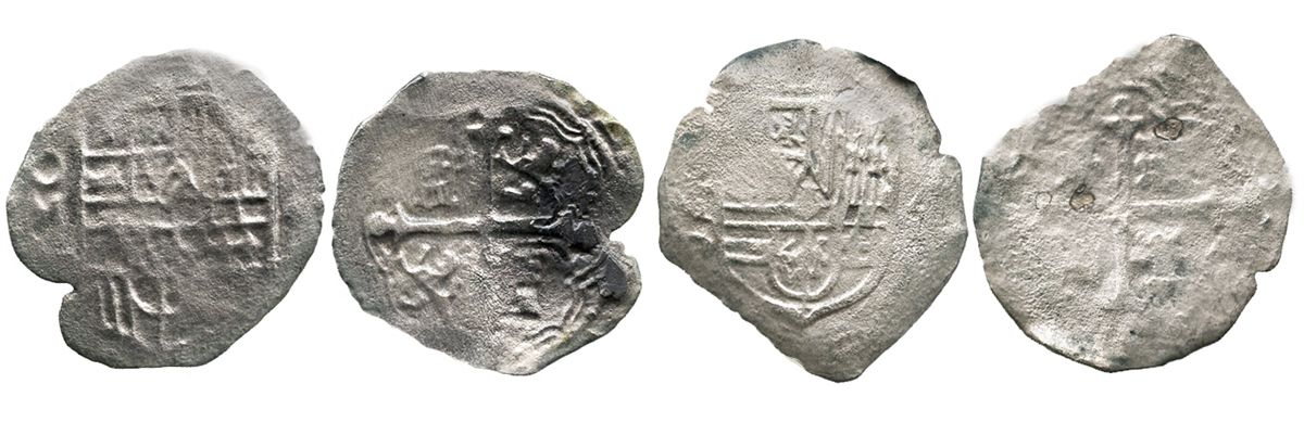 Lot of 2 Mexico City, Mexico, cob 4 reales, Philip III, assayers not visible. 12.8 grams total. Both typically worn and corroded but with clear shields and crosses, one with bold oM. With Seahawk certificates #2074.0005 and 2507.0070. Recovered from: "Dry Tortugas wreck," sunk ca. 1622 west of Key West, Florida