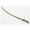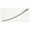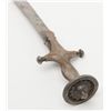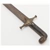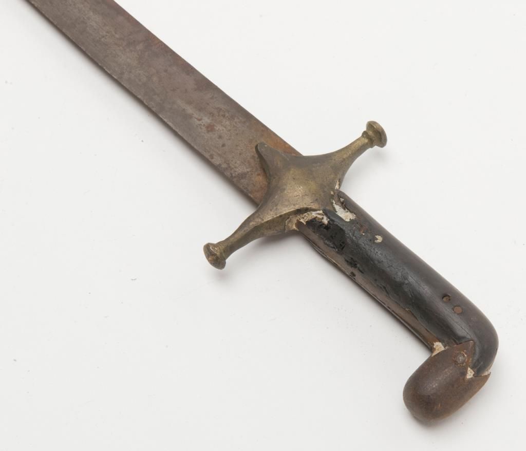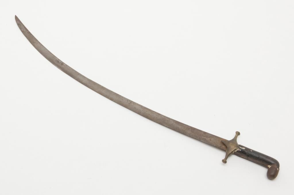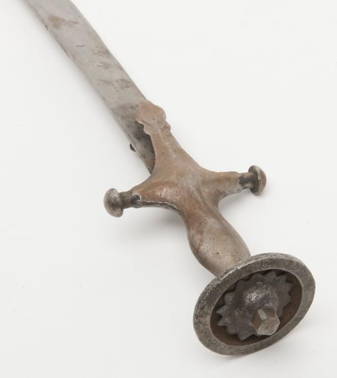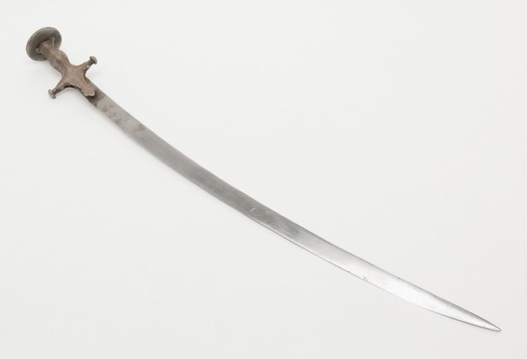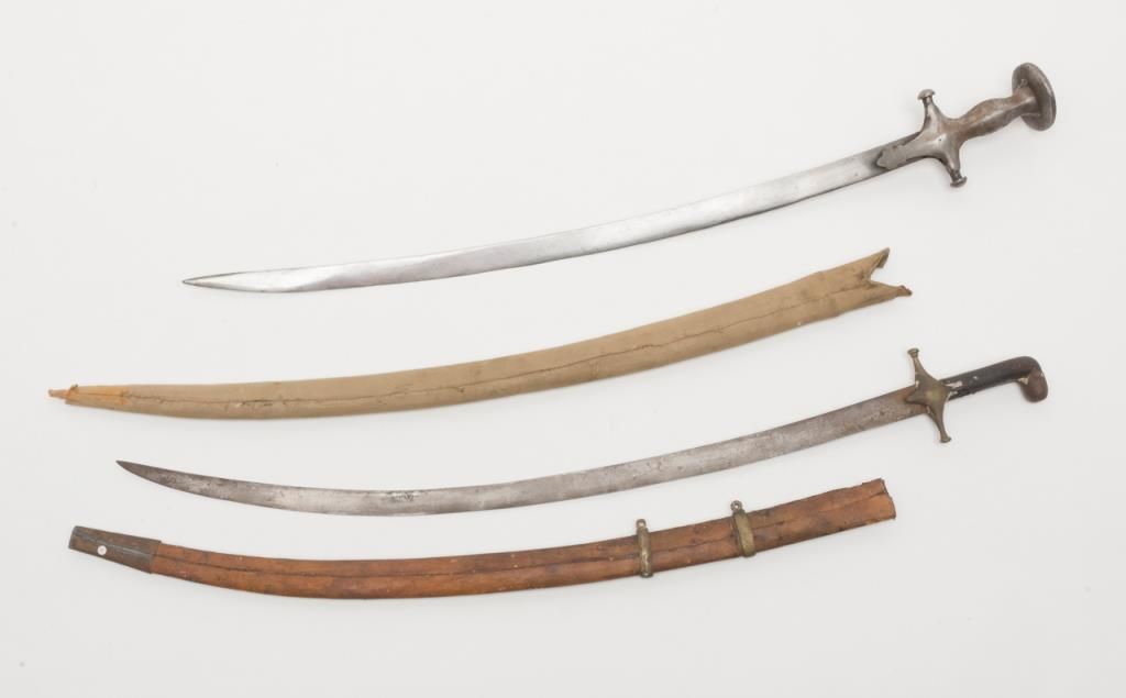 Lot of 2 Mid-Eastern style blades with scabbards; first, one approx. 34” overall with small brass cross guard, wood grip and leather wrapped wood scabbard; fair overall condition; second is a more traditional sword, approx. 36” overall withintegral metal guard and grip, capped with a circular cap retained by a four-sided square metal nut; the wood scabbard is wrapped in material; the metal tip piece is missing. Est.: $200-$400.