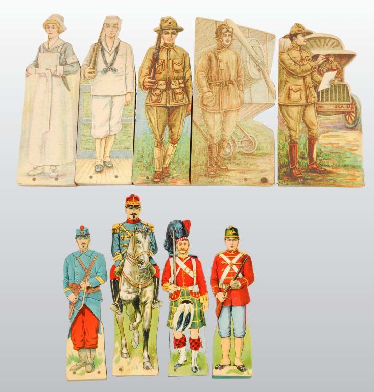 Description Circa 1914-1942. Parker Brothers, set #10, is incomplete wit no box and includes over 50 military figures on wooden stands. The set has light bends and minor damage, but is in good condition. McLoughlin's "Forward March", set #2955, is incomplete with no box. This was the last military set published by the company and includes 24 soldiers on heavy cardboard and 24 stands. Very good condition with minor wear.