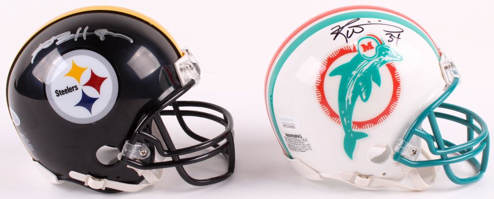 Lot includes all (2) mini helmets shown. Riddell Miami Dolphins mini helmet has been hand-signed in black felt-tip by Ricky Williams. Riddell Pittsburgh Steelers mini helmet has been hand-signed in silver paint pen by Antonio Brown. Please see photos for more details regarding the condition of the lot.