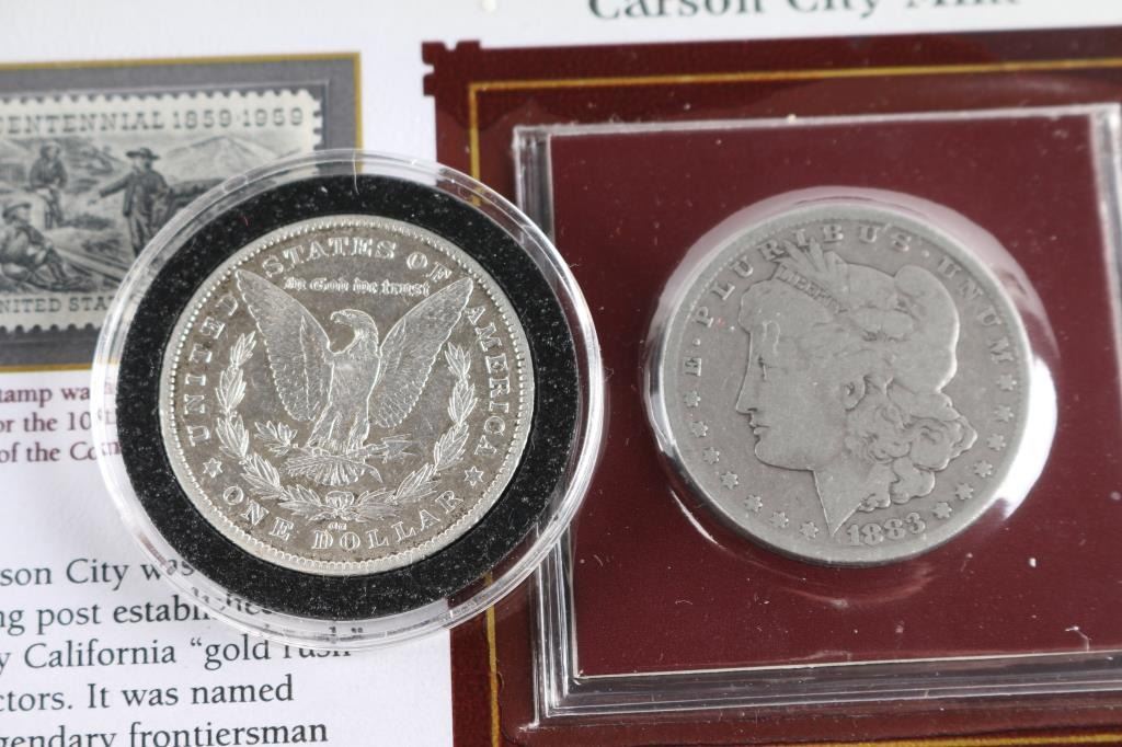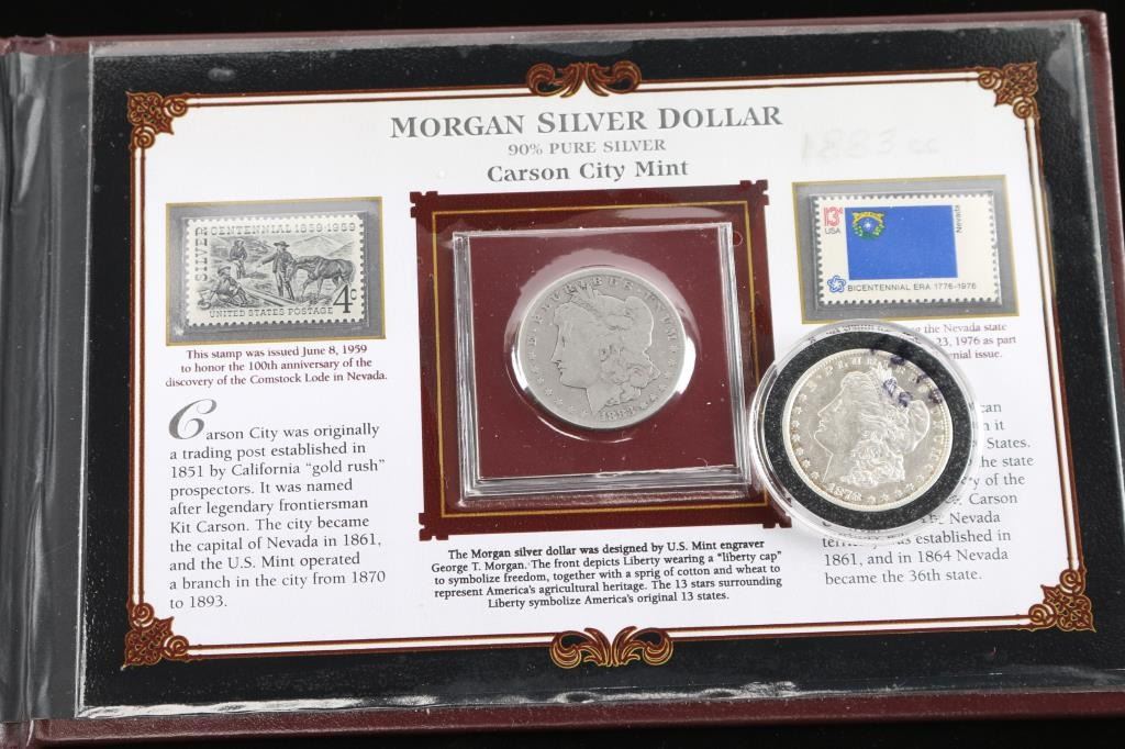 Includes: (1) 1878-CC Morgan Silver Dollar (Not Graded). (1) 1883-CC Morgan Silver Dollar in sleeve and collectors book w/ "Silver Centennial" stamp and "Bicentennial Era" stamp. (Not Graded).
