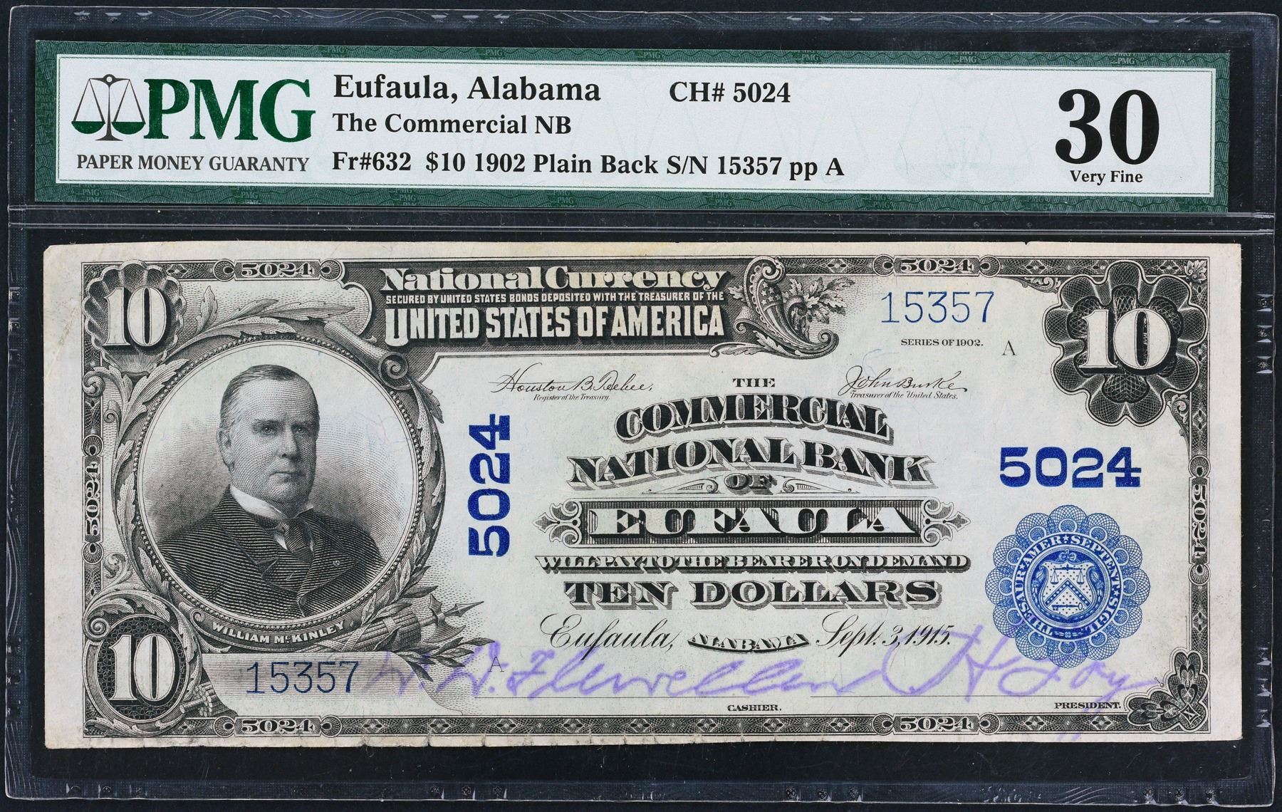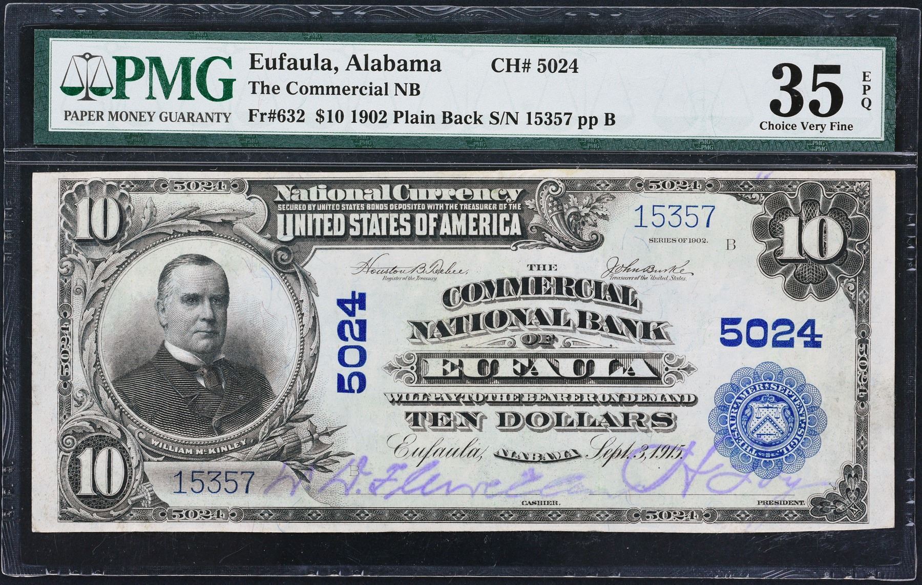 Description: Includes the following: Eufaula, Alabama $10 1902 Plain Back on Charter # 5024 serial # 15357 A pp PMG 30; Eufaula, Alabama $10 1902 Plain Back on Charter # 5024 serial # 15357 B pp PMG 35 EPQ - Partial Cut Sheet