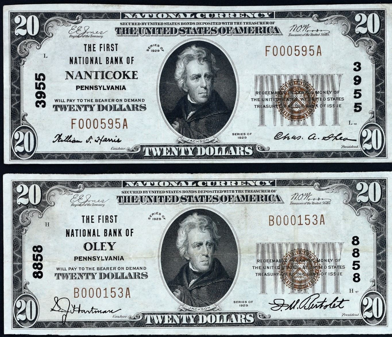 Description: Includes the following: Nanticoke, Pennsylvania $20 1929 Type 1 on Charter # 3955 Very Fine; Oley, Pennsylvania $20 Type 1 on Charter # 8858 Very Fine.