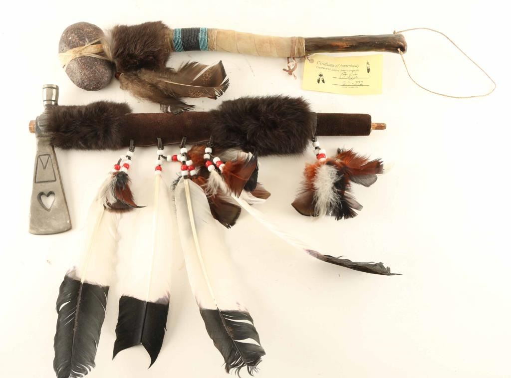 Includes (1) Tomahawk decorated with feathers, fur, leather, and beads; measures 18 1/2" long. Lot also includes (1) skull crusher decorated with beads, leather fur and feathers; measures 18 1/2" long.
