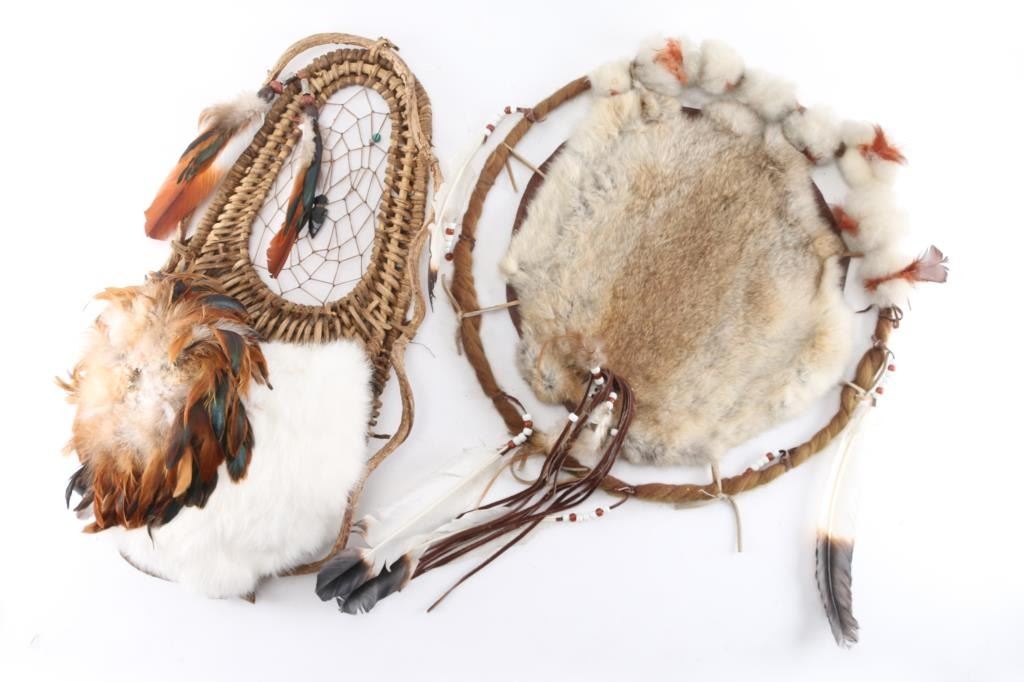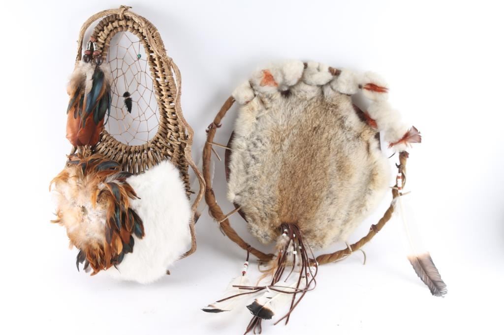 (1) Wood woven wall art with feathers and fur, measures 24" x 12". (1) Round wall hanging with coyote fur and feathers, measures 19" circumference.