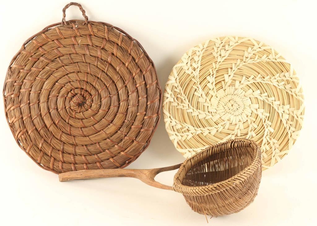 Larger dark brown is 9 5/8" and light tan is 8 1/2"; both in very good condition. Also included is a basketry ladle with wood handle; in very good condition .