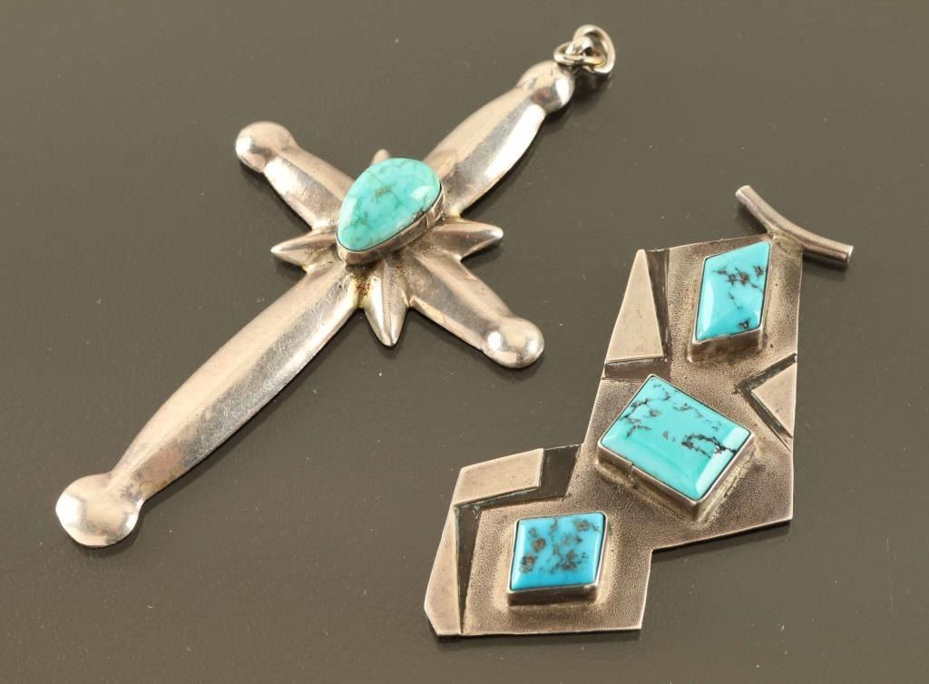 (1) Sandcast Cross pendant with turquoise (1) Modern design Navajo Pendant made by Booby Thompson