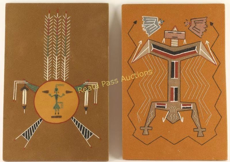 "This is Cull" (The Sun) by Joe Begay and "Big Thunder" by F. Yazzie. Both on board and measure 18"x12"