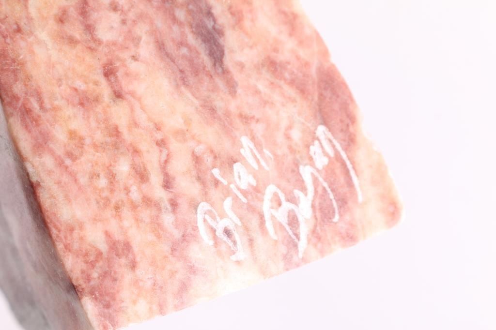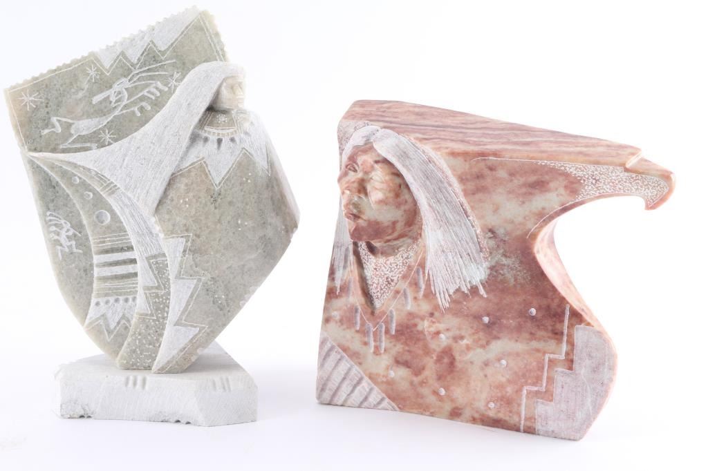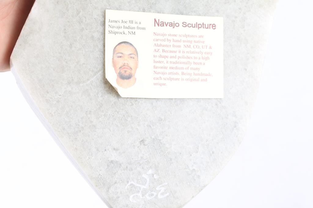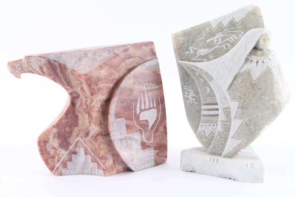 Both carved in native alabaster, one by artist James Joe III, measures 8" tall by 5 1/2" wide. The other is 6" tall by 7" wide, unknown artist.