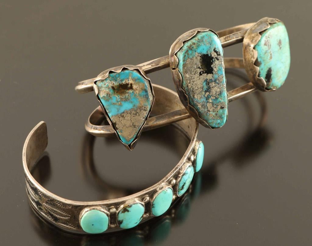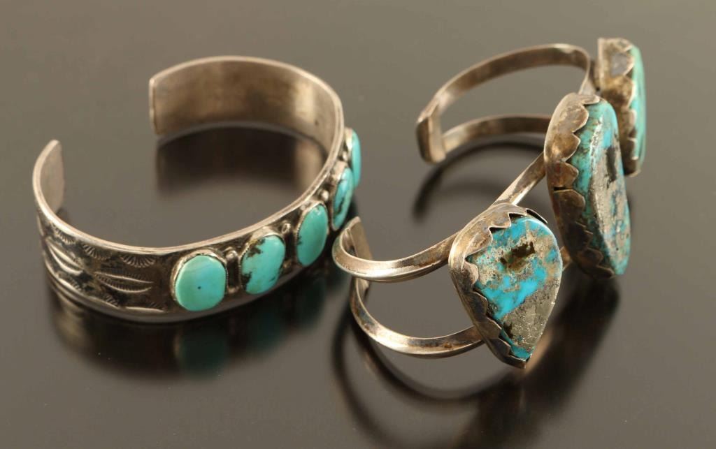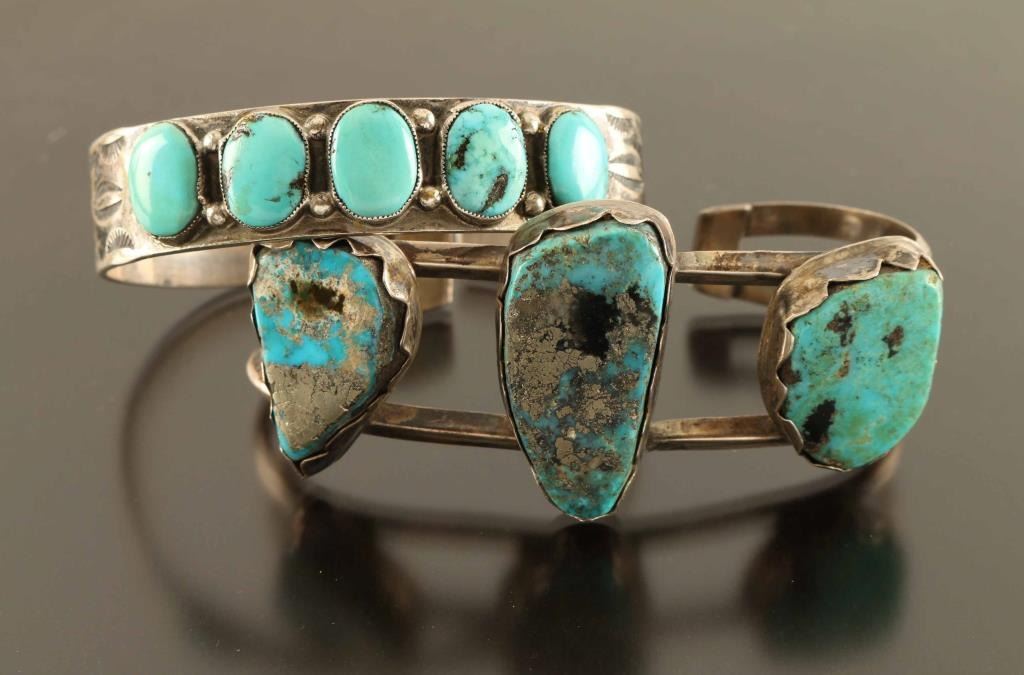 5 Stone turquoise cuff set in sterling and a 3 large stone cuff both unmarked
