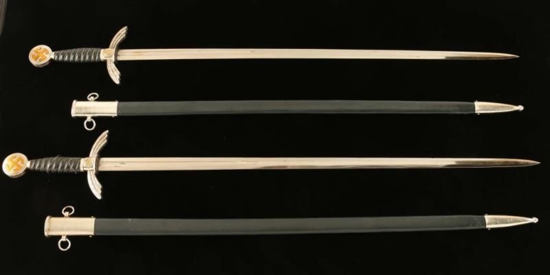 Both have round swastika pommels with leather wire wrapped handles with repeat round swastika emblem and feather design at guard. Blade is marked 'Gaeflen' and comes with scabbard. Show use and wear.