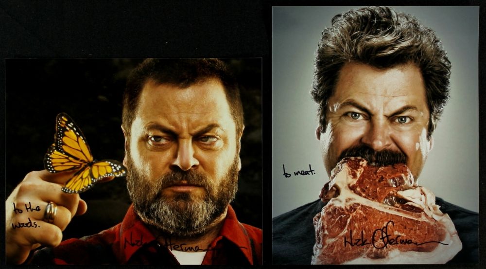 Each photo measures 8" x 10" in size. Hand-signed and inscribed in black felt-tip pen by Nick Offerman (TV show, Parks and Recreation). The autographs include an LOA and lifetime authenticity guarantee from Pristine Auction.