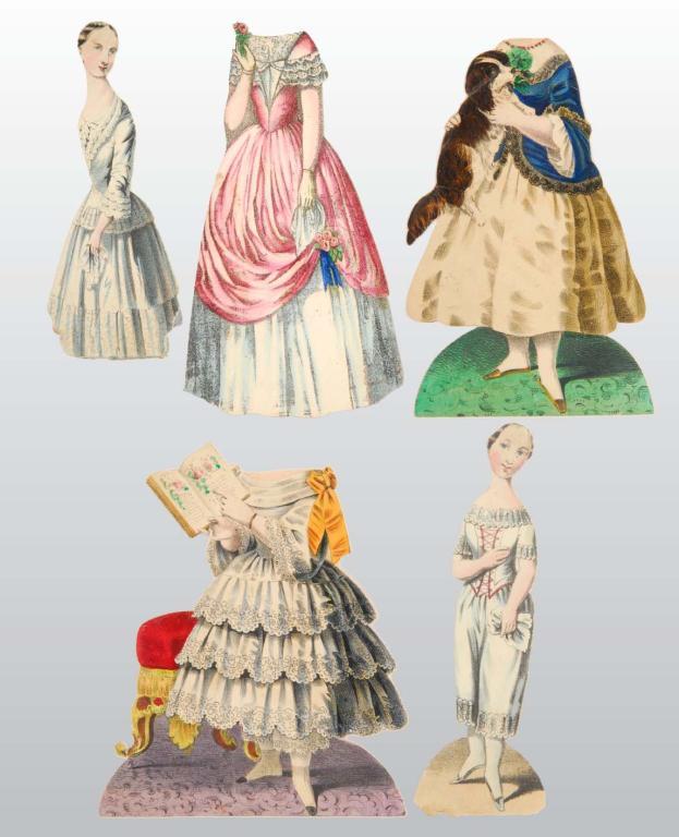 Description Circa 1830. This 6.5-inch front/back lady has eight hand painted gowns, including a bridal gown and veil. The doll is reinforced, her feet are missing and her skirt is damaged. The second doll is 5.5-inches tall with neck damage, soil and missing feet. She has eight single side outfits. The clothing for both dolls is in excellent condition.