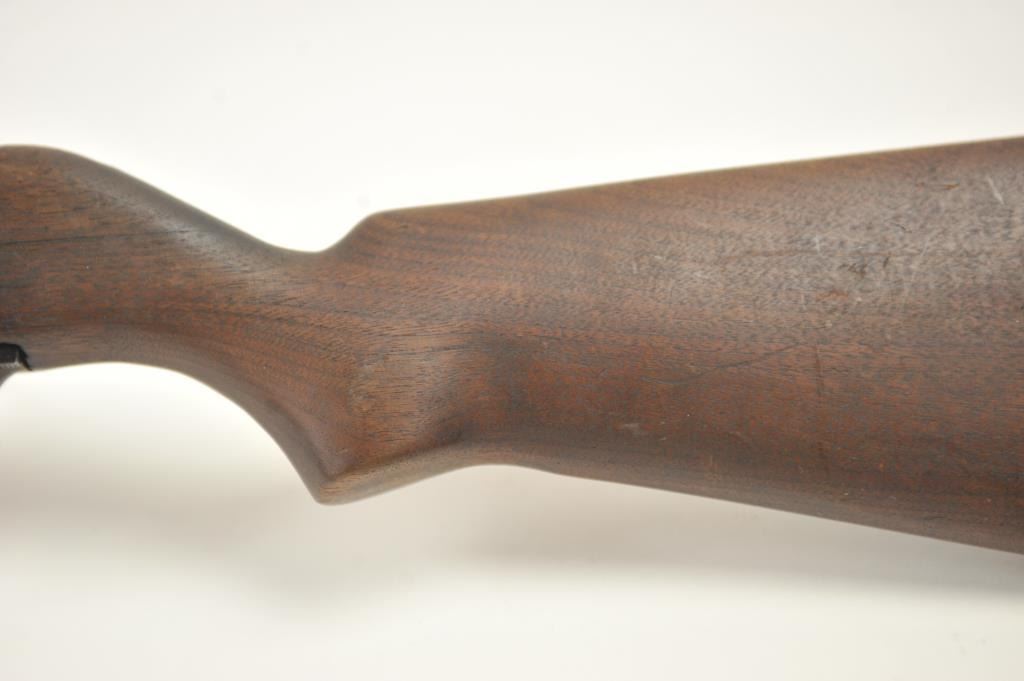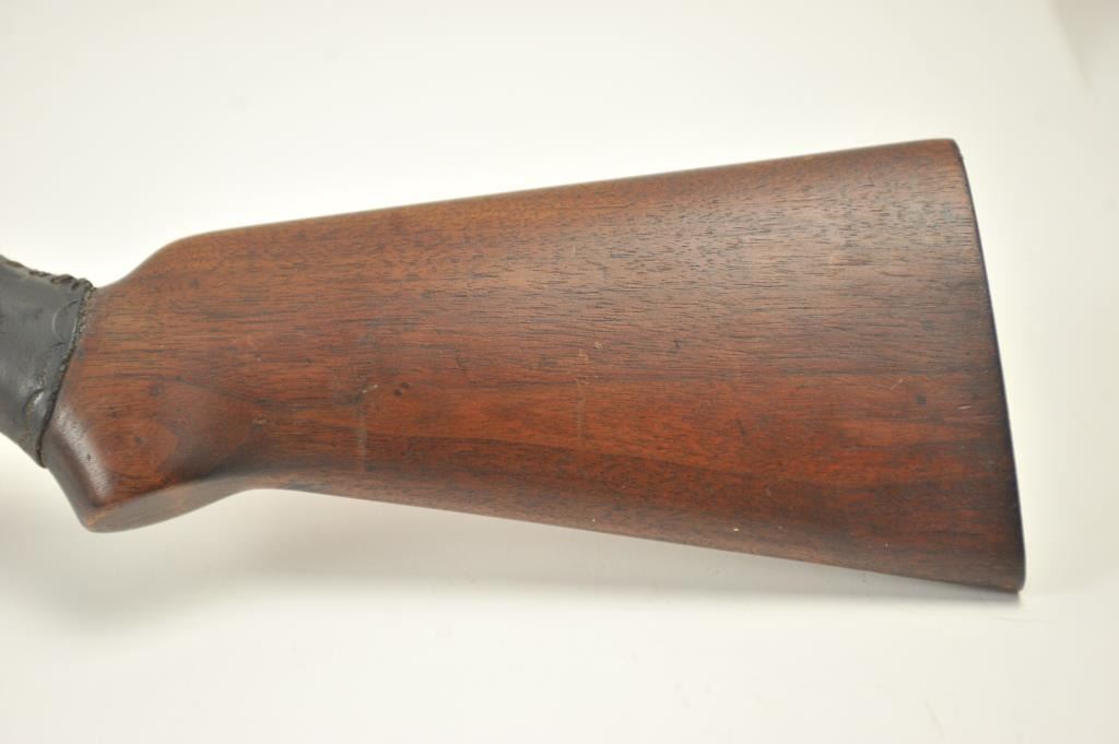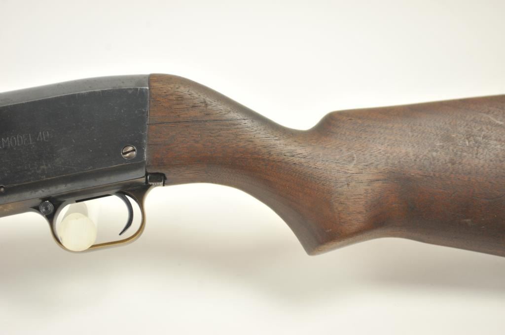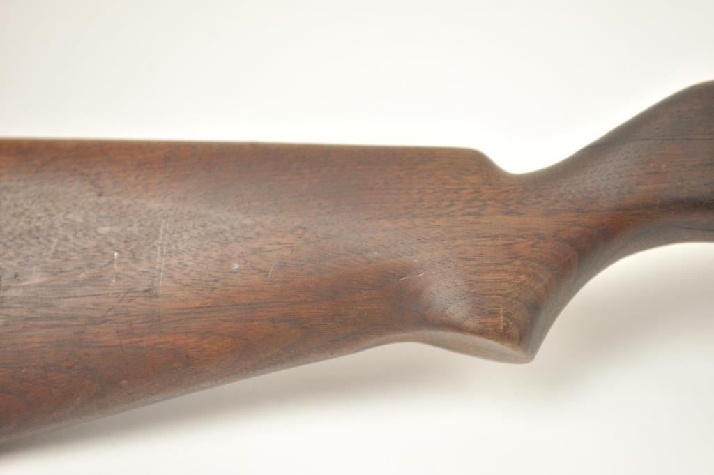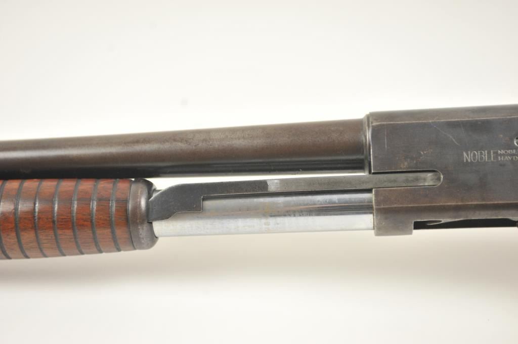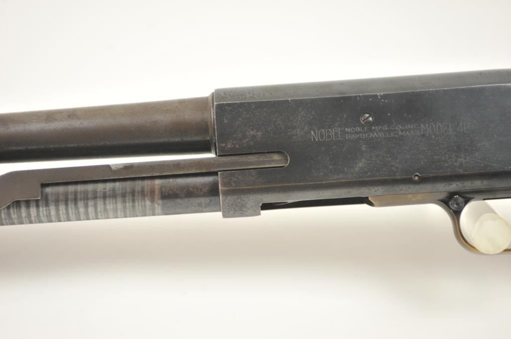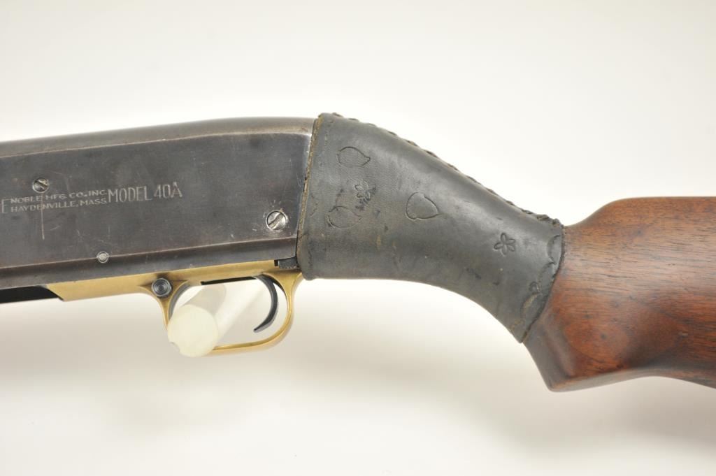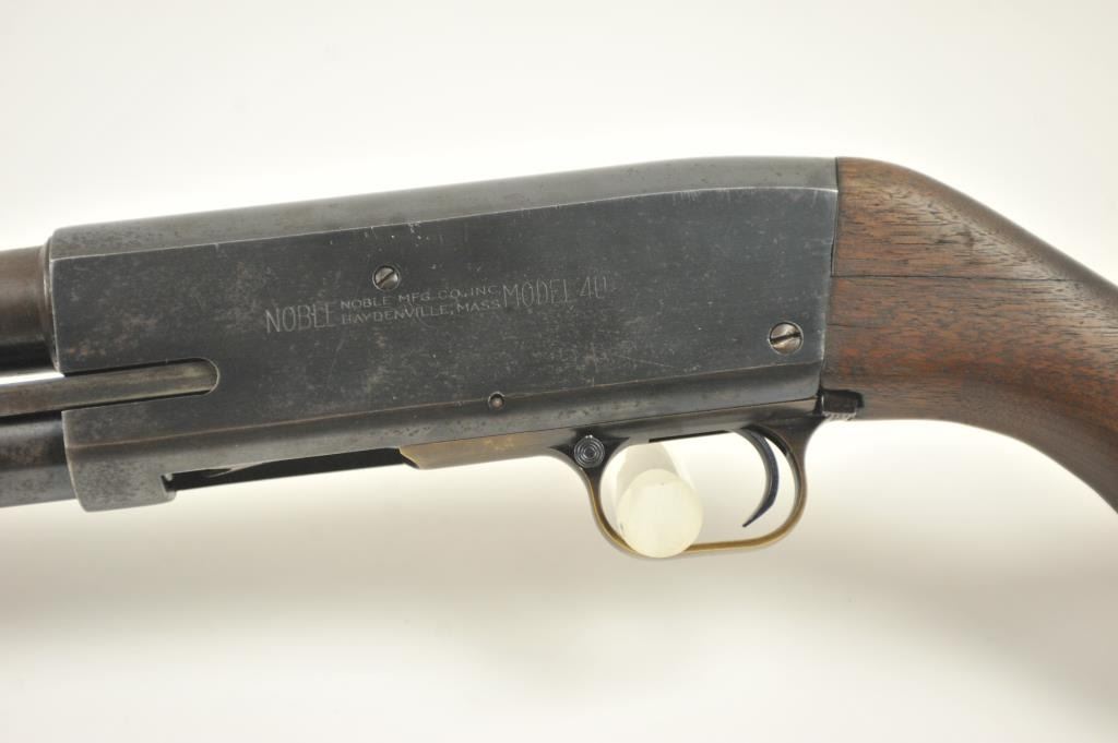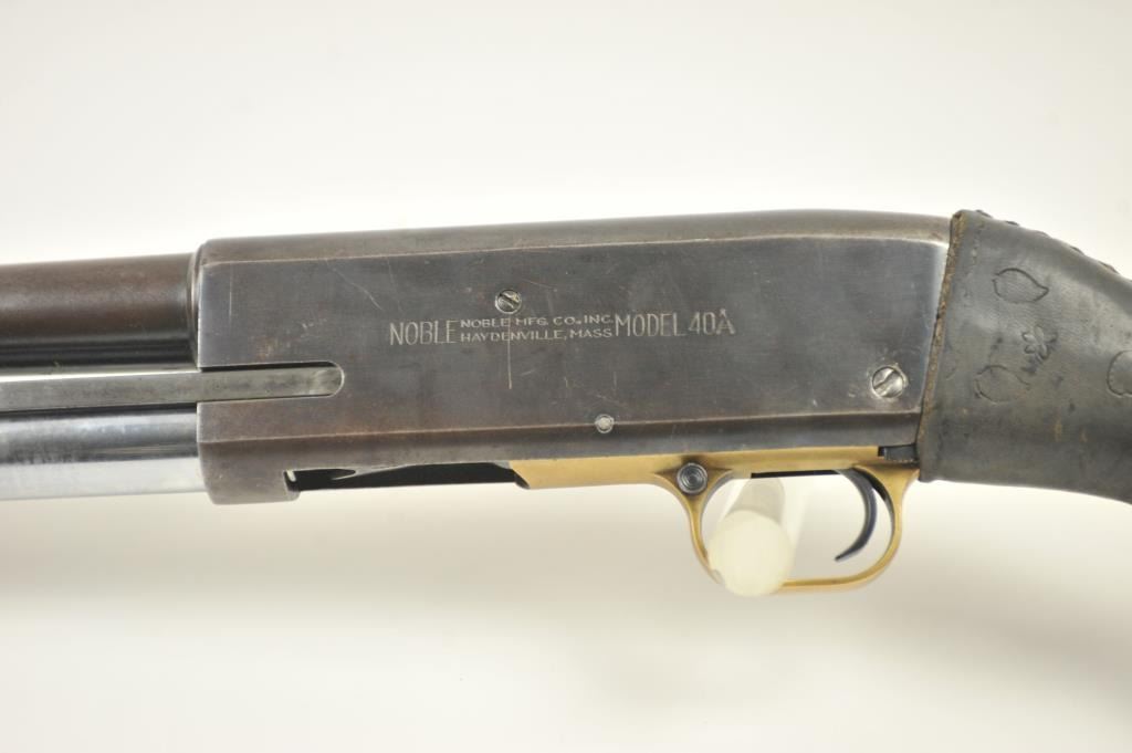 Lot of 2 Noble shotguns, first a Noble Model 40, #NSNV, 12 Ga., 28” barrel with Multi Choke, brass front bead sight and wooden stock with plastic butt plate. The shotgun is in good condition overall, showingapproximately 80-90% original finish with light freckling, bore is good, action is sticky. The stock is fair with a repair to the wrist, and the butt plate is slightly ill fitting. The second is a Noble Model 40A,#NSNV, 12 Ga., 28” barrel with Multi Choke, brass front bead sight and wooden stock with no butt plate. The shotgun is in good condition overall, showing approximately 80-90% original finish which has drifted to a brown patina, bore is good, action is good. The stock is fair with a repair to the wrist and is now covered in leather. Magazine tube and bolt have been chromed. (C&R/PPT) Est. $100-200