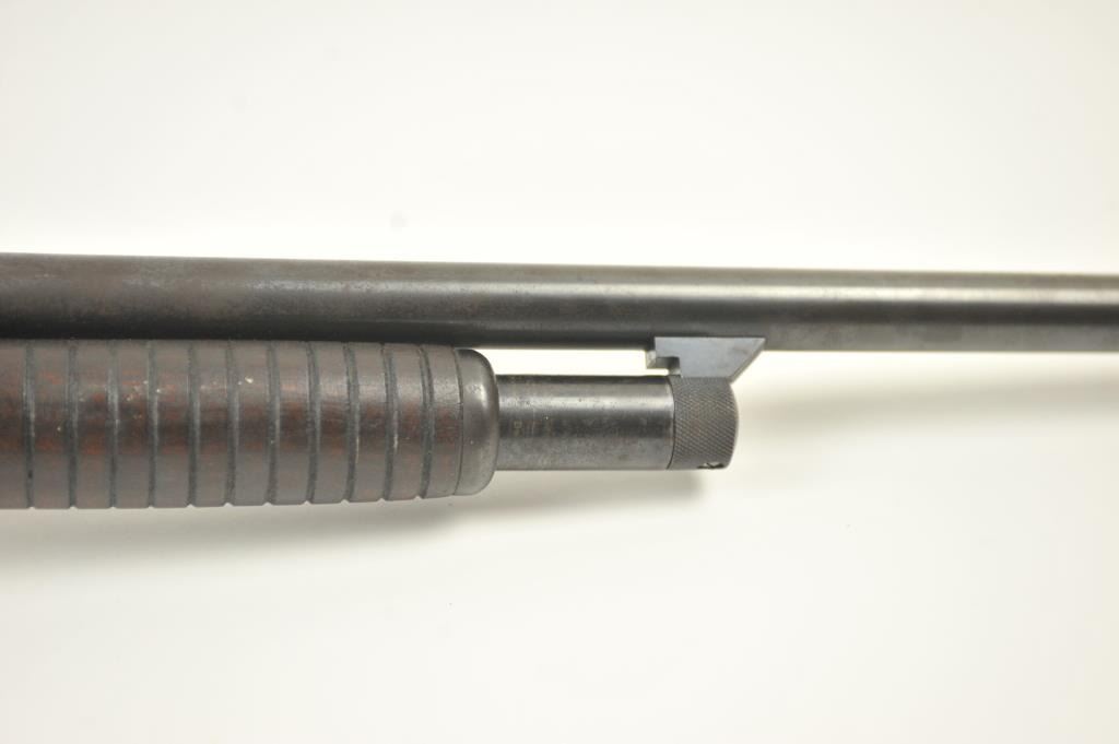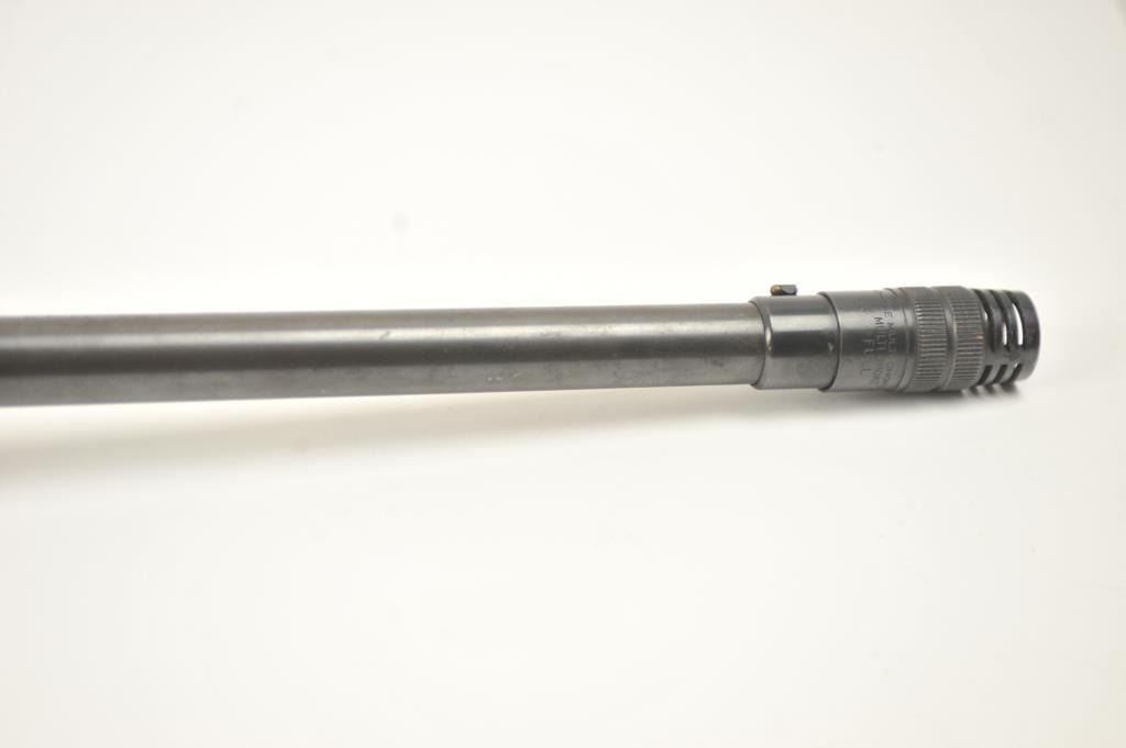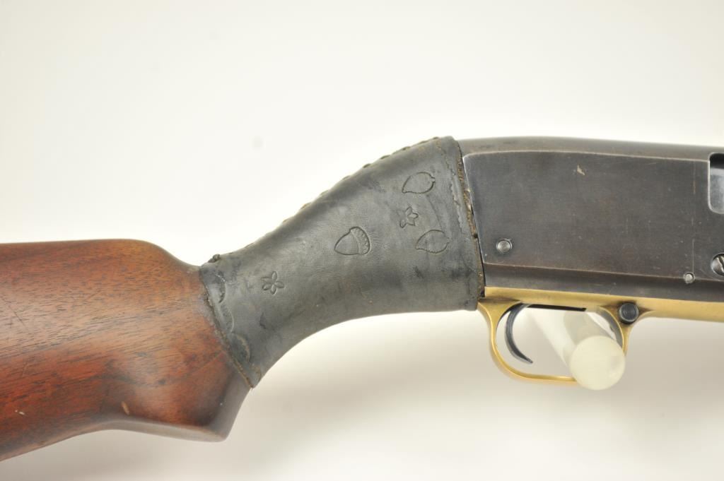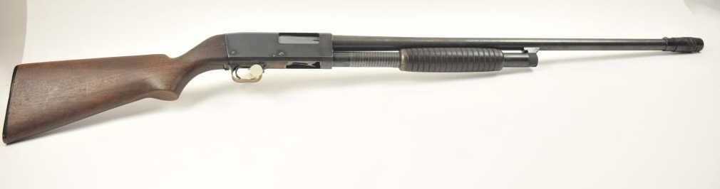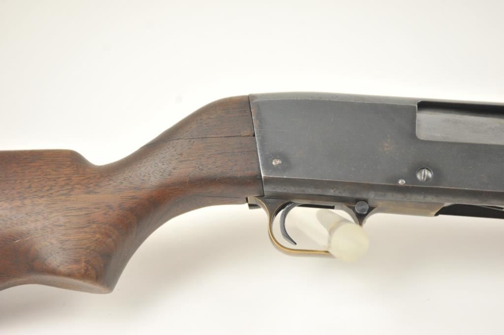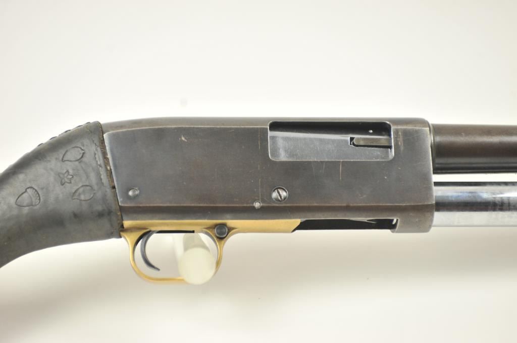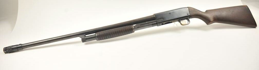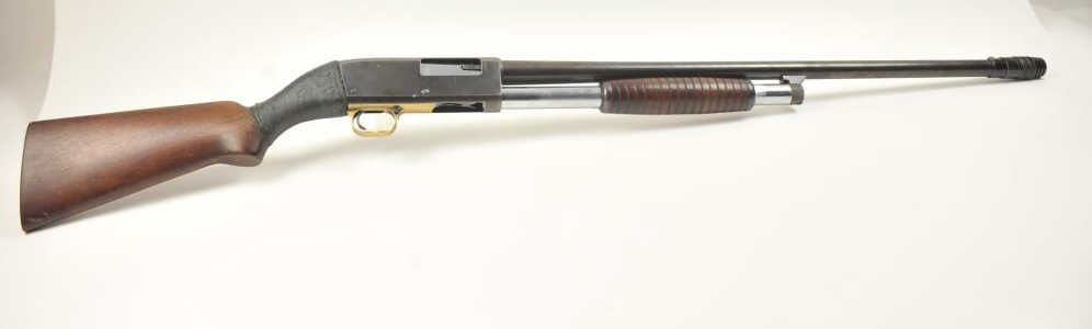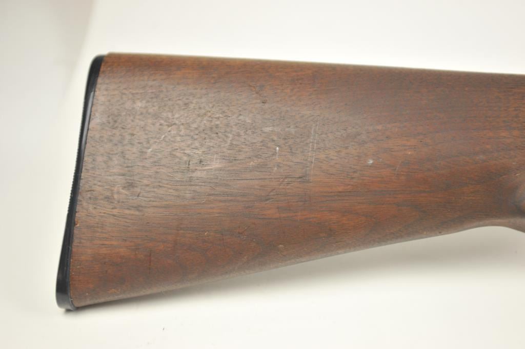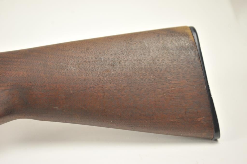 Lot of 2 Noble shotguns, first a Noble Model 40, #NSNV, 12 Ga., 28” barrel with Multi Choke, brass front bead sight and wooden stock with plastic butt plate. The shotgun is in good condition overall, showingapproximately 80-90% original finish with light freckling, bore is good, action is sticky. The stock is fair with a repair to the wrist, and the butt plate is slightly ill fitting. The second is a Noble Model 40A,#NSNV, 12 Ga., 28” barrel with Multi Choke, brass front bead sight and wooden stock with no butt plate. The shotgun is in good condition overall, showing approximately 80-90% original finish which has drifted to a brown patina, bore is good, action is good. The stock is fair with a repair to the wrist and is now covered in leather. Magazine tube and bolt have been chromed. (C&R/PPT) Est. $100-200