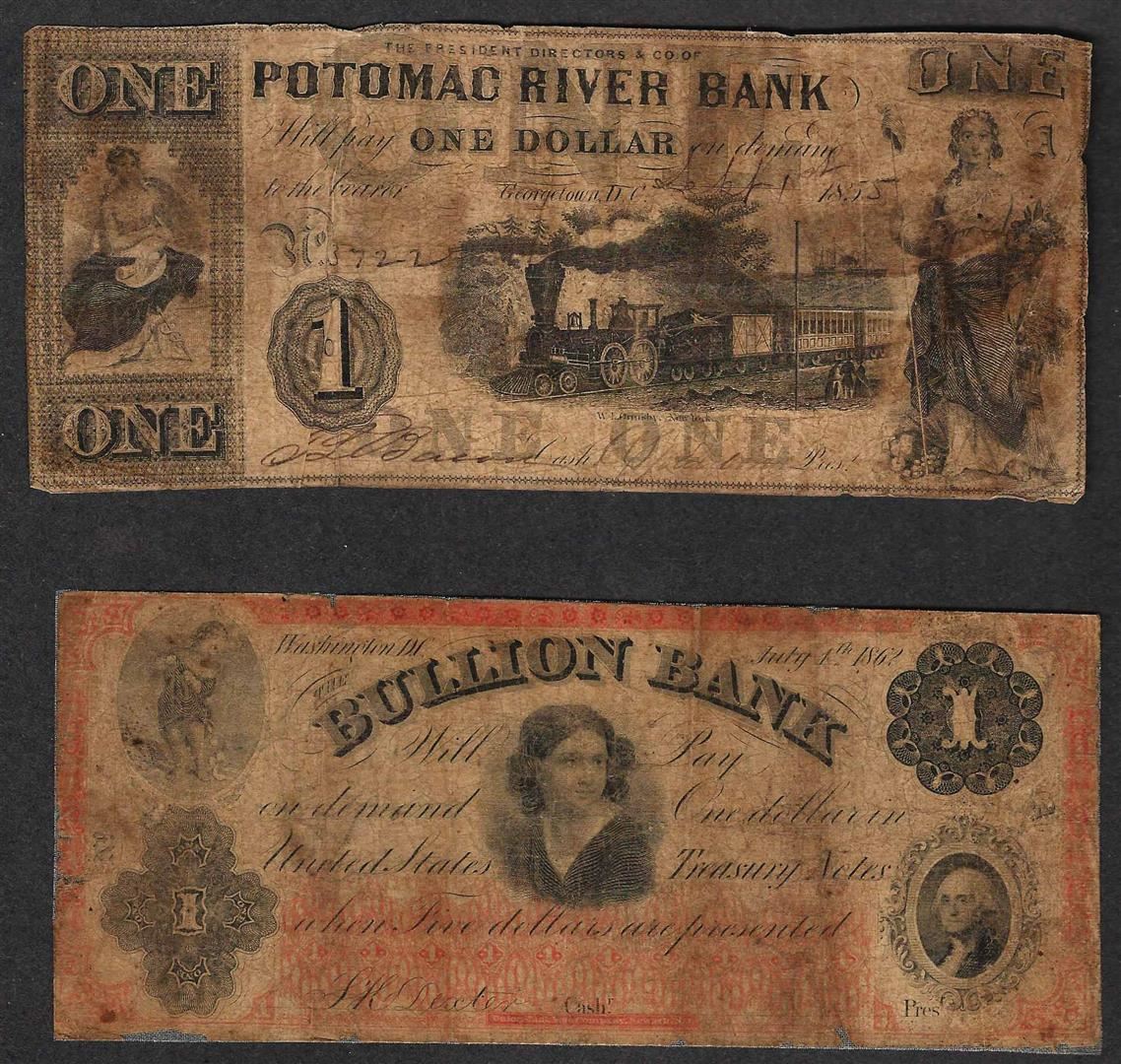 Lot of (2) Obsolete Bank Notes - 1855 $1 Potomax & 1862 $1 Bullion Bank