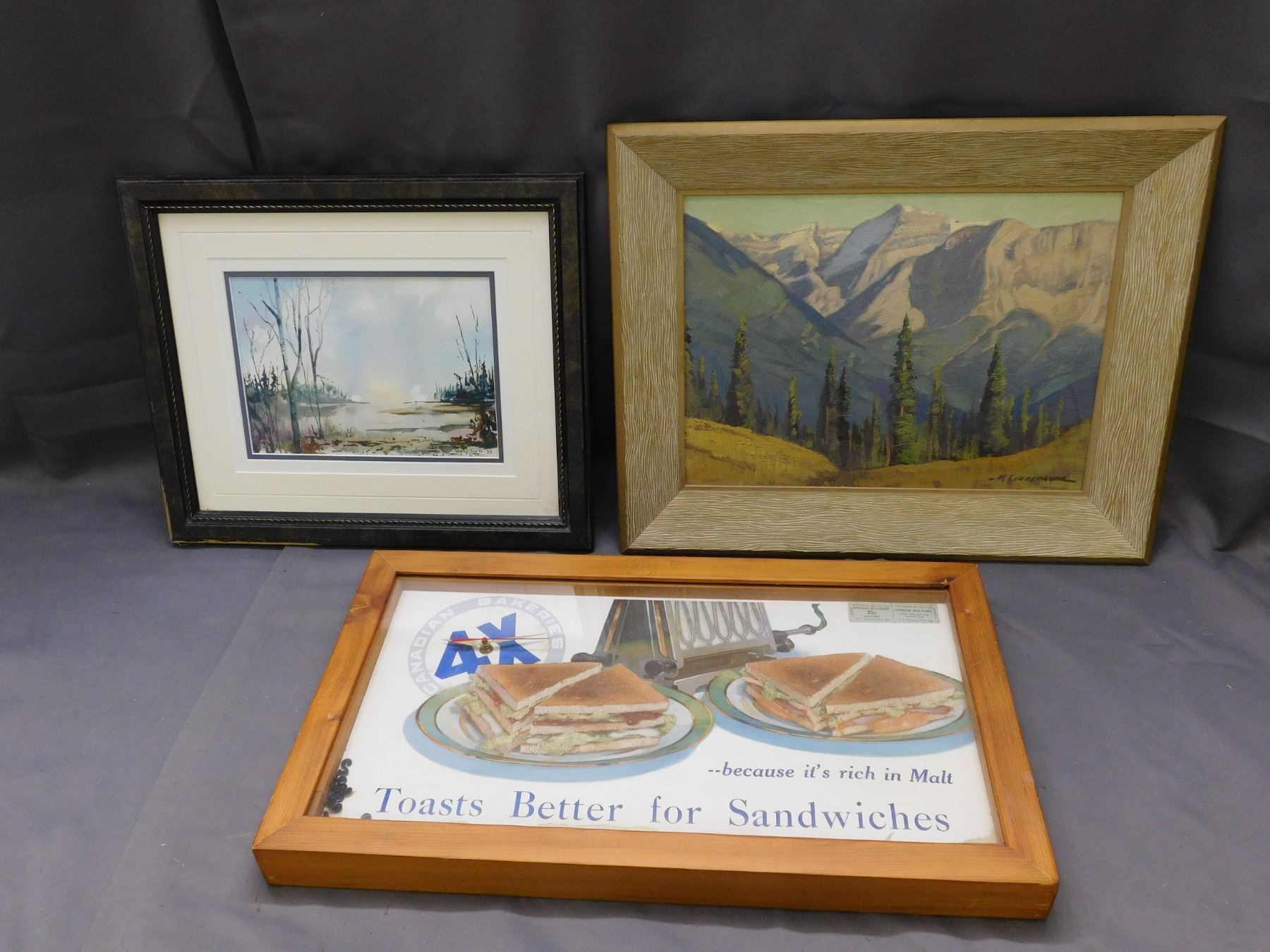 Lot of 2 Original Artwork Paintings and Vintage Toaster Ad Wall Clock *as is*