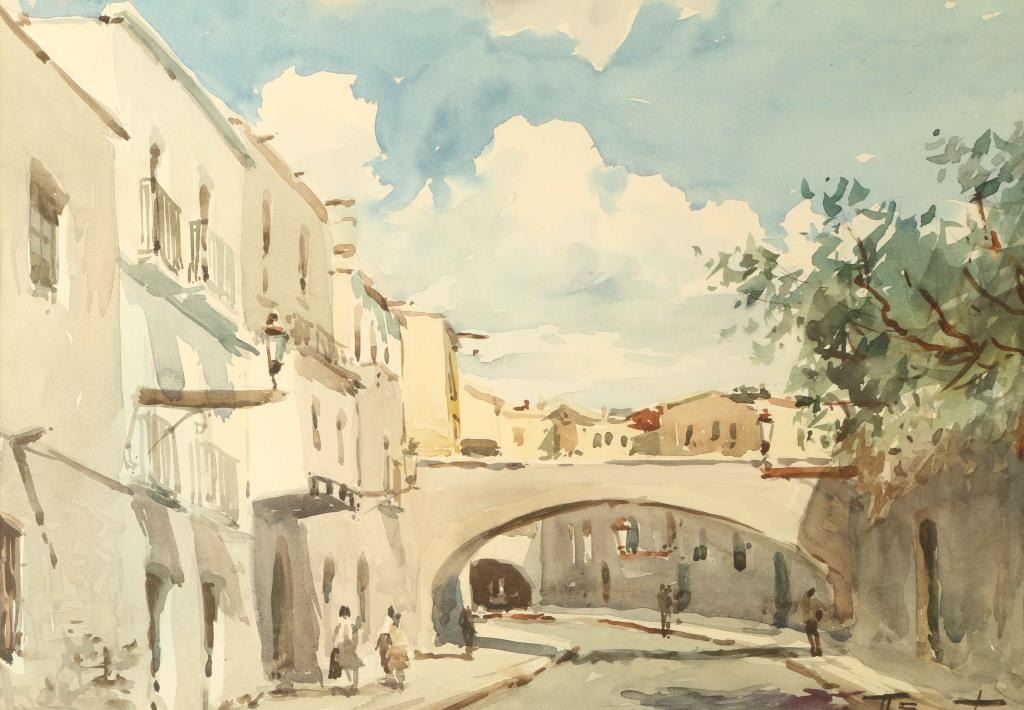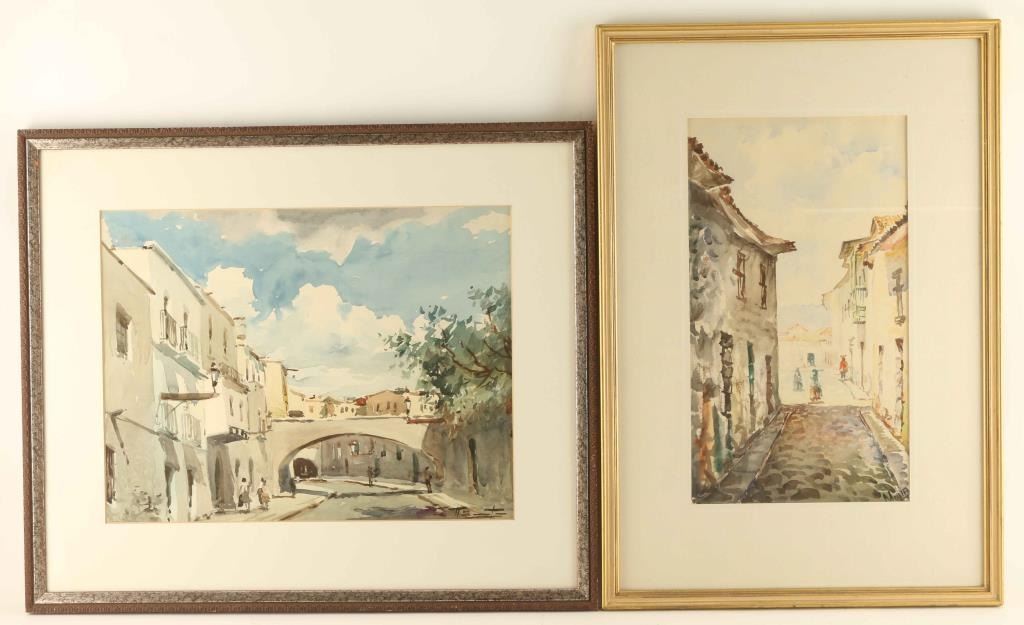 by unknown artists depicting street scenes. Each one has a title in a foreign language-'Mejia' and other is illegible. Matted and framed 16 1/2" x 13 and 'Meija' measures 15 1/2"x9".