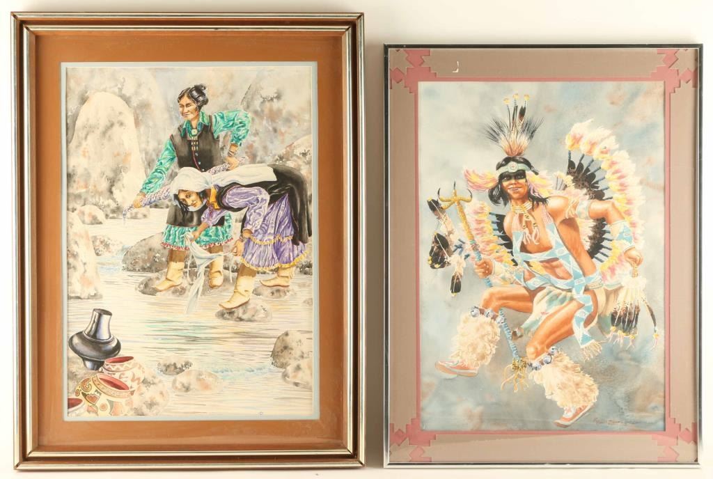 by Swenson (1) depicting two Native American ladies on wash day at the river, signed lower right. Image measures 19 3/4" x 13 3/4" in double mat and wood frame. (1) ceremonial dancer, signed lower right. Image measures 19 3/" x 14" with geometric cut double mat and metal frame.