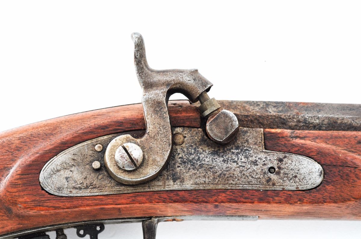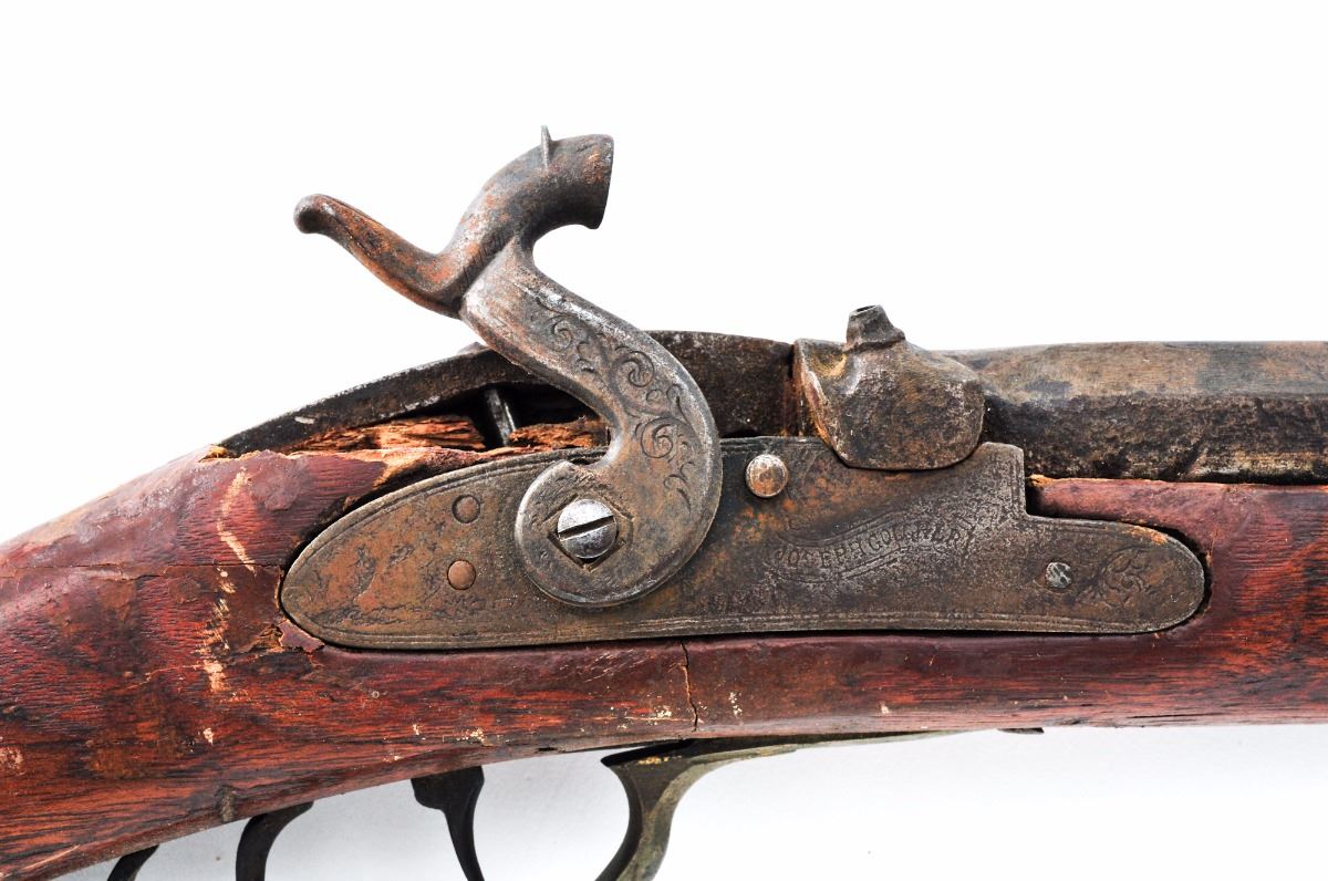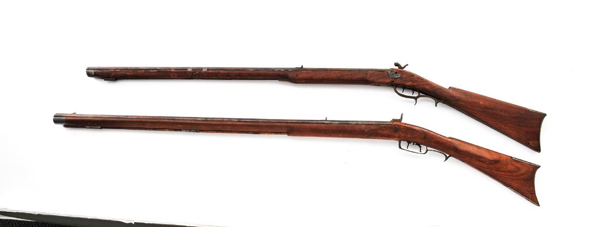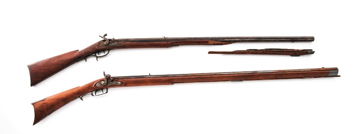 Lot of Two (2) Pennsylvania type Fullstock Percussion Rifles: (1) .38 cal., approx. 40'' barrel, brown finish, smooth full-length walnut stock, double set trigger, dovetailed silver blade front sight and dovetailed ''V''-notch rear sight. No maker's name. Lock is lightly engraved but markings are unreadable. Condition is good. All metal parts have taken on an even grey/brown patina with light oxidation overall. Stock is in good condition with a repaired break at toe of butt with many light dents and surface scratches. Stock furniture and triggerguard appear to be iron; end cap is lead. Sear does not hold the hammer back. (2) ) .38 cal., approx., 36'' barrel, brown finish, smooth full-length walnut stock, silver blade front sight and dovetailed ''V'' notch rear sight. No maker's name. English lock is lightly engraved ''Joseph Golcher''. Condition is fair. All metal parts have taken on an even grey/brown patina with light oxidation overall. Stock is in poor condition with substantial losses near lock and ramrod channel, and many light dents and surface scratches overall. Brass stock furniture and triggerguard appear in good oxidized condition; end cap appears to be zinc. Lock and double set triggers do not function. Est.: $150-$300/lot. (Antique)