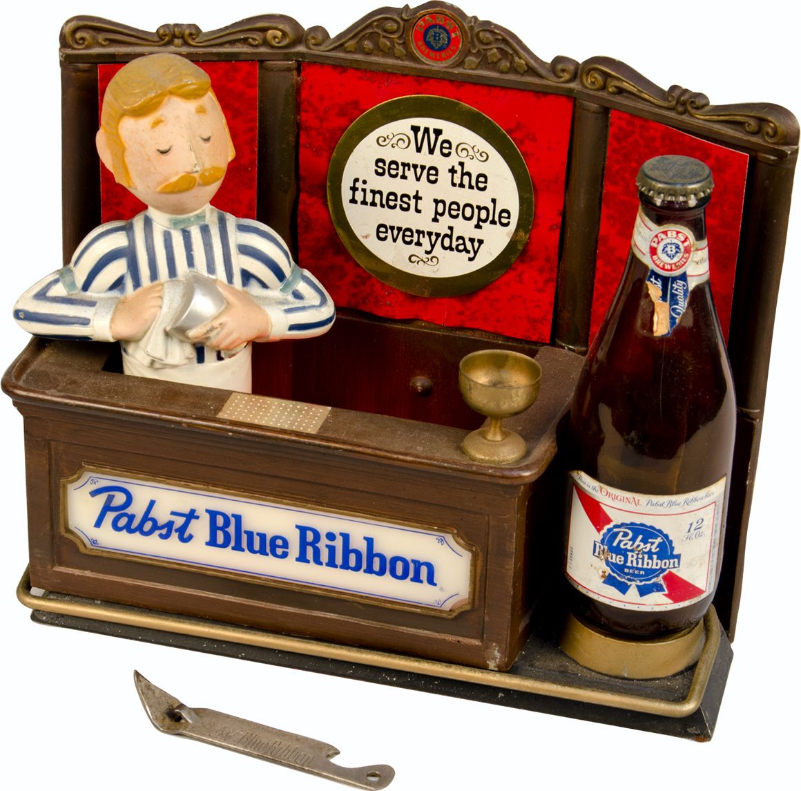 Lot of 2 Pabst Blue Ribbon Items: 1 - Pabst Blue Ribbon Metal Countertop Advertisement Light-Up Display w/ Bottle featuring bar and bartender, "We Serve the Finest People Everyday" - 12" x 10"h & 1 - Pabst Blue Ribbon bottle opener