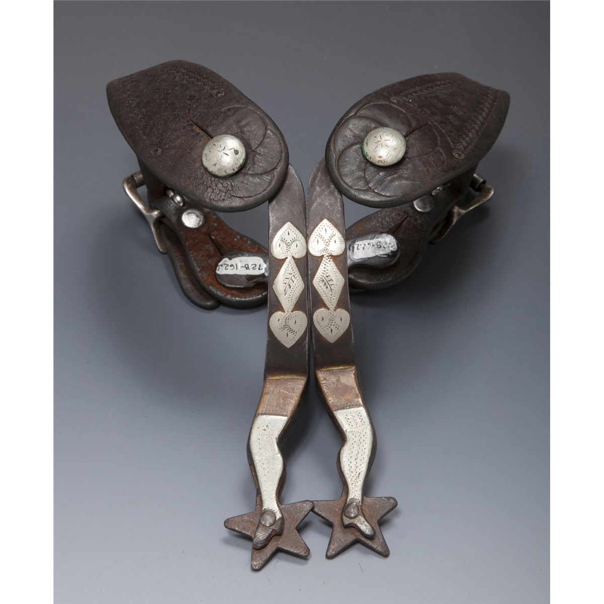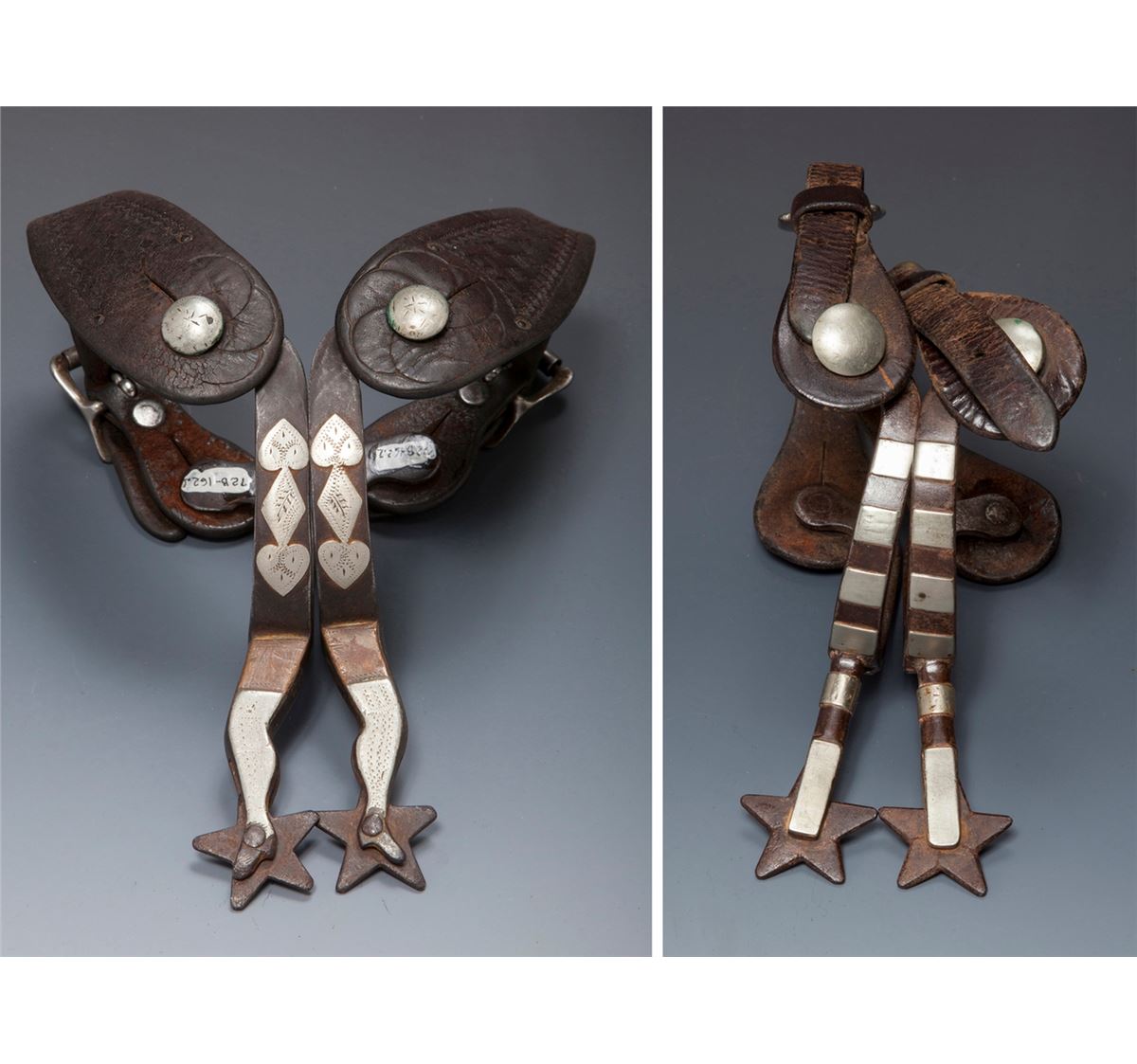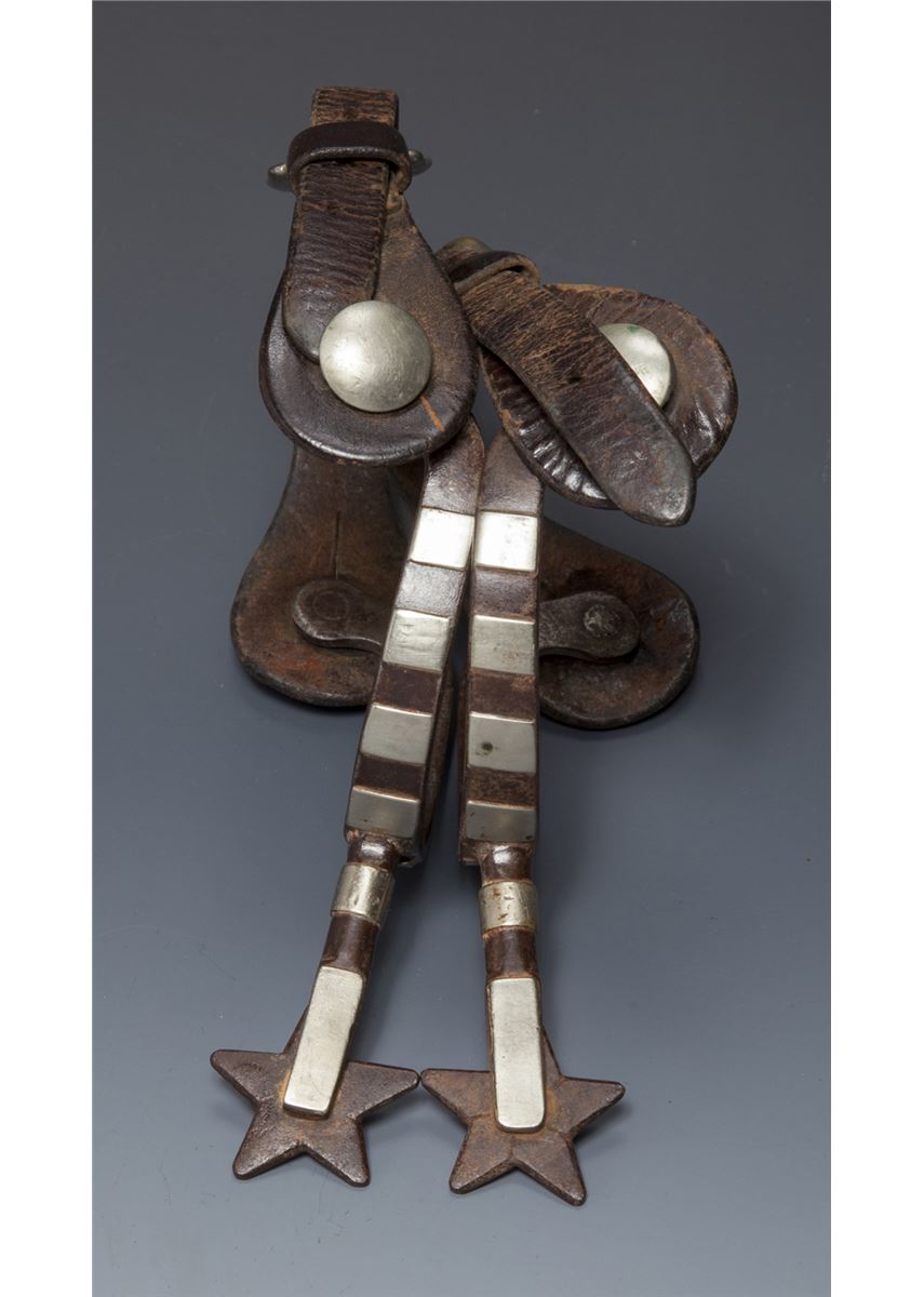 a) McChesney spurs with 5-point star rowels, 1 ¼" on silver and copper overlaid gal-le" shanks. Worn on the shoes and remounted on the bands.