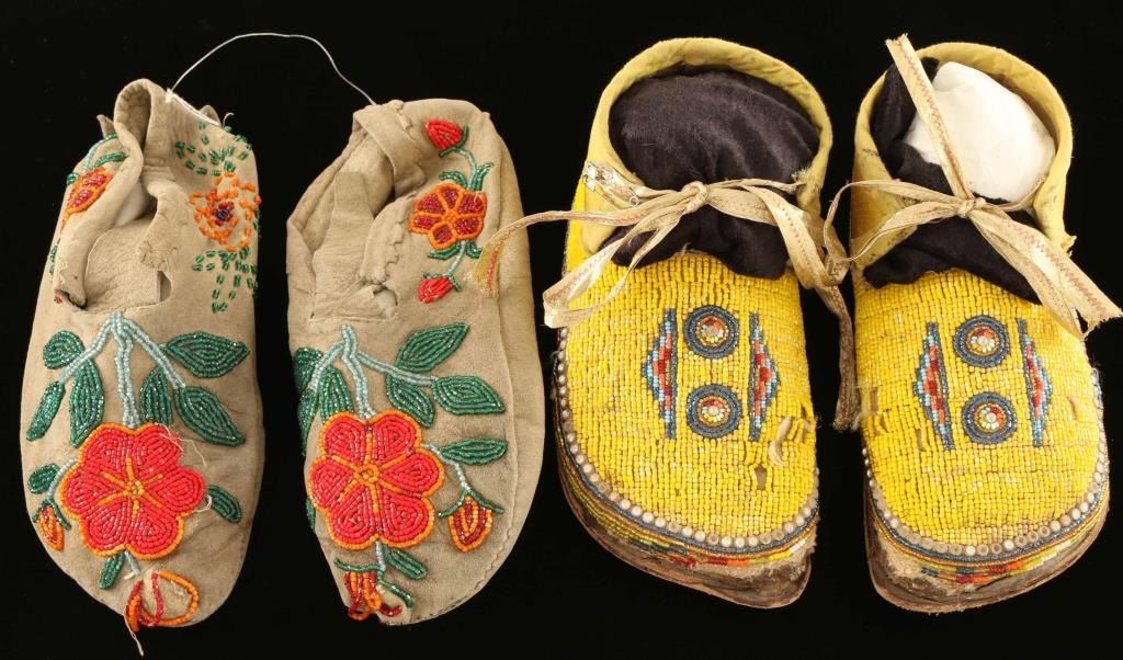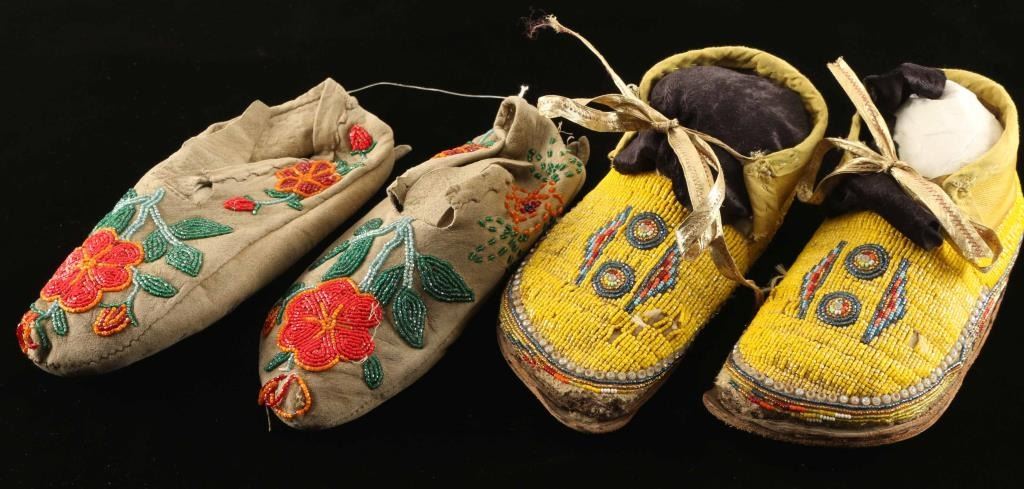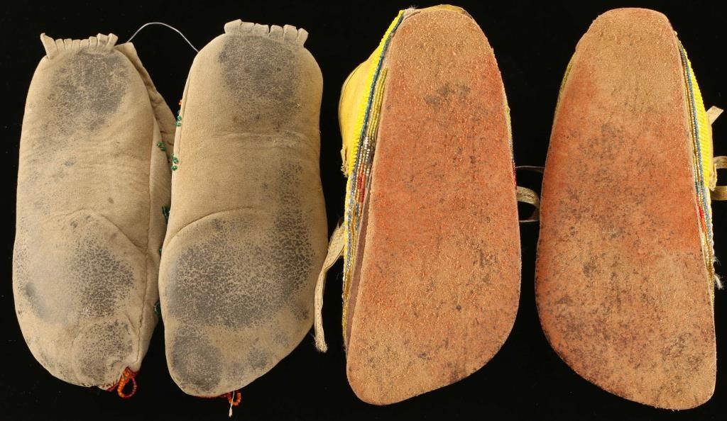 Yellow beaded moccasins with geometric designs, and front tie closure measure 8 1/2"l , and a pair of floral beaded moccasins with scalloped edge that measure 9"l. Both show wear and age and losses to beadwork.