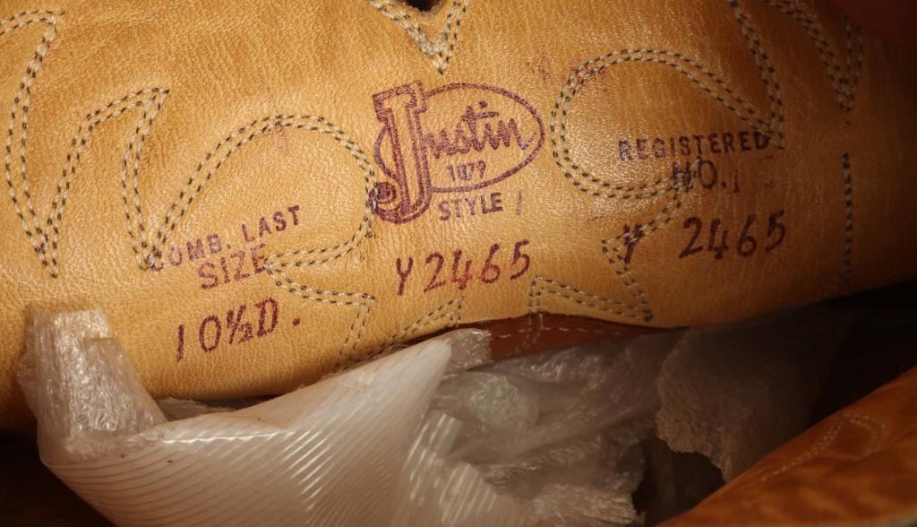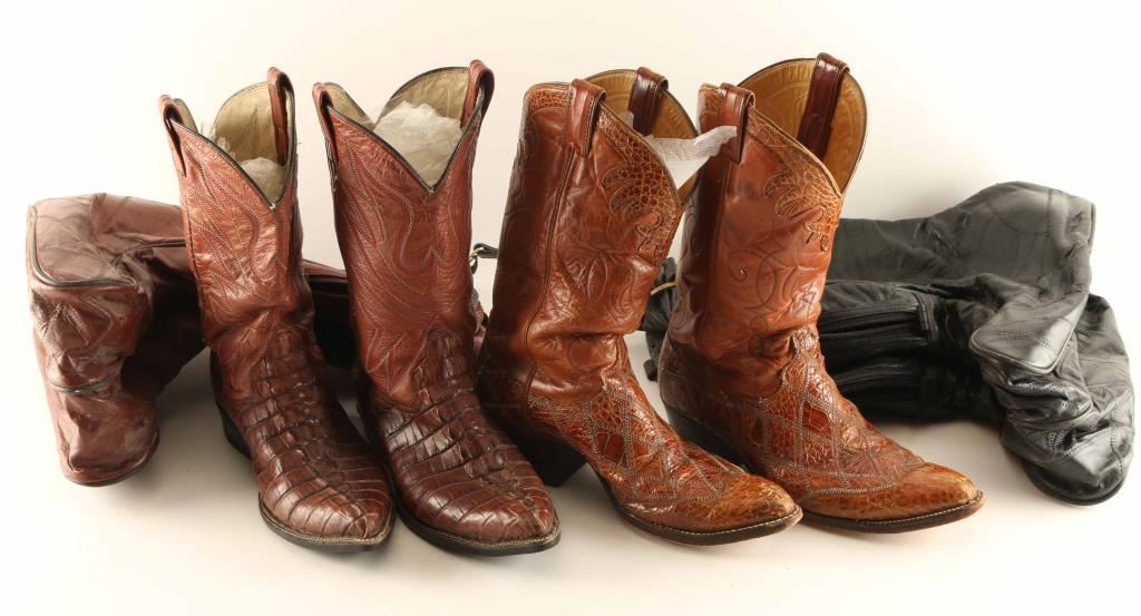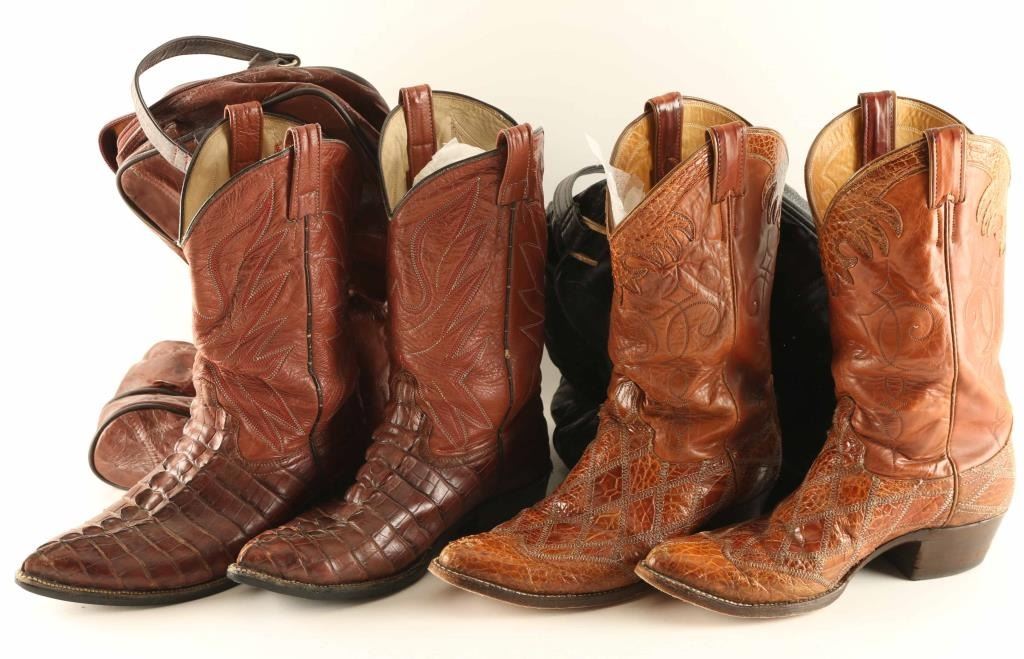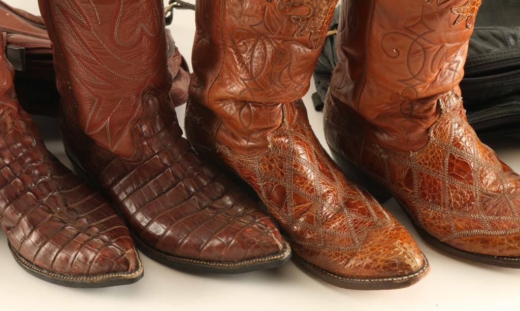 (1) Brown alligator boots, have been re-soled. Good condition show little wear. Size 9. (1) Brown Justin caiman boots with diamond stitched pattern on vamp. Size 10 1/2D good used condition. Both come in carriers with handles.