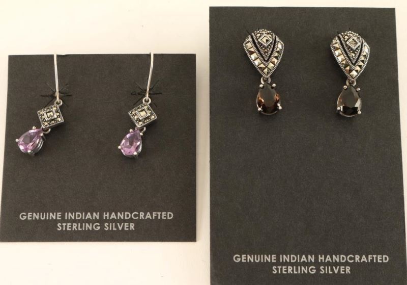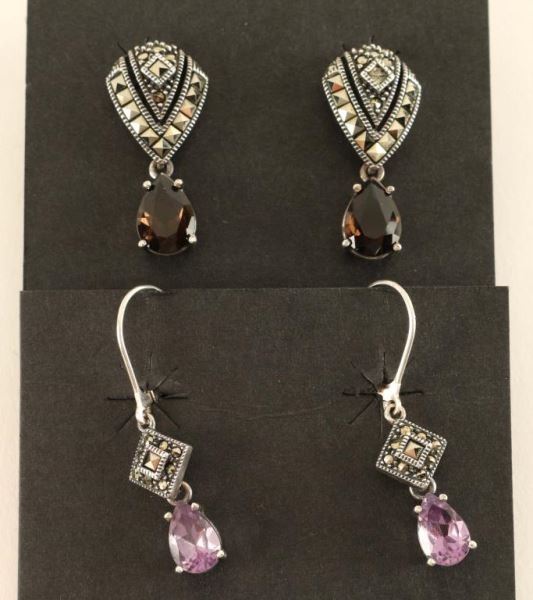 1 Pair Smoky Quartz And Sterling Marcasite Post Dangle Earrings And 1 Pair Amethyst And Sterling Marcasite Closed Back French Hook Earrings,