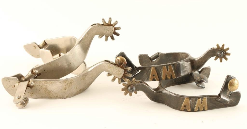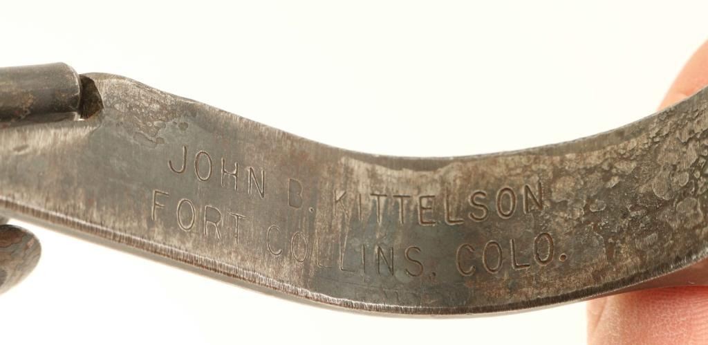 (1) Pair of John B. Kittelson Fort Collins, CO marked handmade spurs. Steel with a dark iron finish, etched buttons with 'A M' on each heel band. (1) Pair nickel Kyle marked spurs.