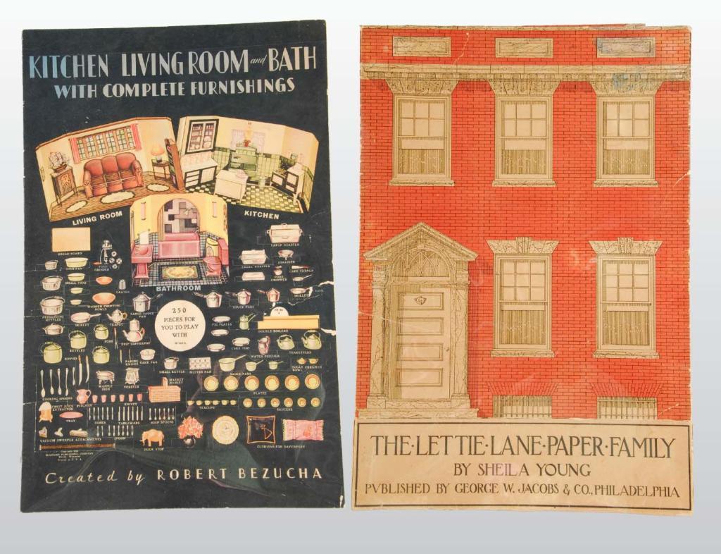 Description Dated 1932. "Kitchen, Living Room and Bath" has six pages (including covers) of 250 room and accessory pieces. One piece was removed from the cover. Circa 1910 to 1920. A three-fold light cardboard house for the "Lettie Lane paper Family" with tears, color scrapes and wear. A hard to find dwelling for Sheila Young's paper dolls.
