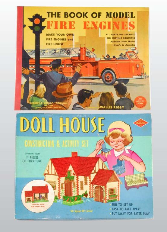 Description Dated 1951. "The Book of Model Fire Engines", published by Grosset and Dunlap, in an eleven page activity book with punch out fire engines and fire house. All the parts are die cut scale models. One piece has been punched out, but still with the book. ND. The "Built-Rite Doll House" is a boxed set with twelve cardboard pieces to build the house and four complete, unpunched pages of flooring and furniture pieces. An instruction sheet is included. Both toys are in fine condition.