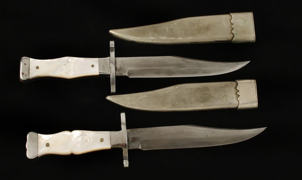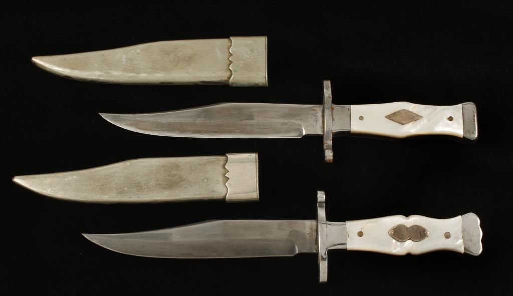 With metal scabbards. The knives measure approx 10-1/2" overall with 6-1/2" blades. Clip points. The quality is very good with good quality hand work.