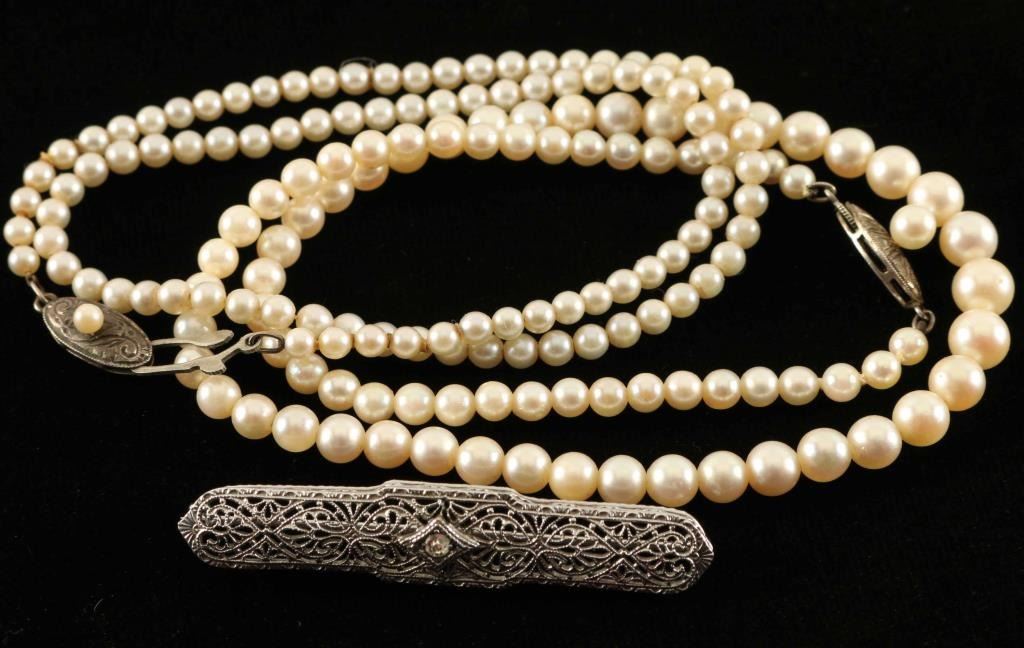(2) Small pearl necklaces vintage choker length (1) Deco style brooch with CZ stone.